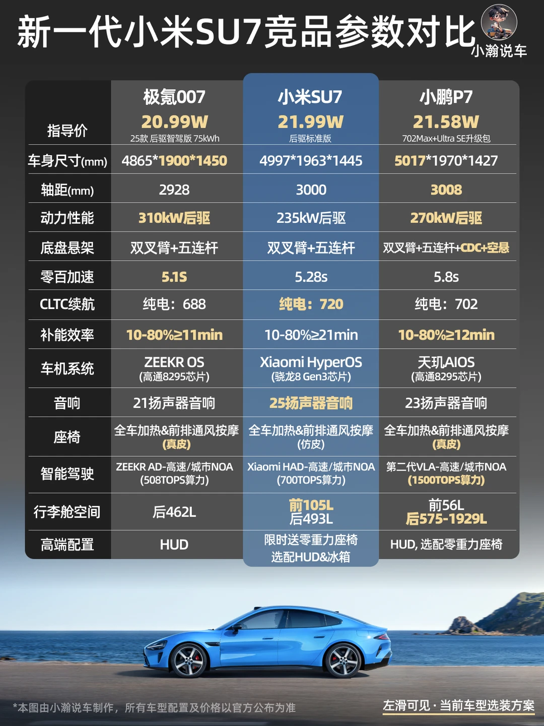 对大多数非寒冷地区用户,小瀚更推荐标准版。一方面700km+的续航已经能覆盖大多数场景。同时如果SU7是你的人生第一台车,以小米的底盘调校能力,空悬+CDC对于驾驶感的影响对于新手司机不一定有比较大体感。当然如果预算充足,或者本身生活在北方多雪地区,选满血的Max也可以。Pro版这次相较标准版反而没拉开太大差距。