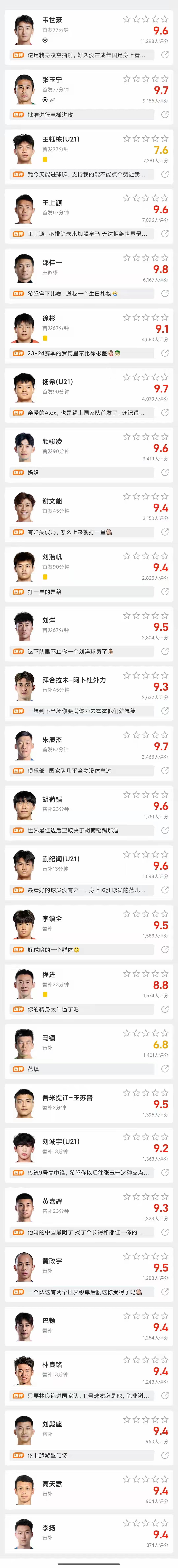 直播吧与懂球帝,给国足2比0胜库拉索球员评分对比! 国足在FIFA系列赛,澳大利亚区首轮比赛,国足2-0力克世界杯参赛队库拉索! 赛后查了一些资料,直播吧和懂球帝的评分可以说明一些问题! 直播吧评分: 门将:颜骏凌6.7分; 后卫:杨希7.5分、朱辰杰6.8分、刘浩帆7.2分、刘洋7.1分、胡荷韬6.6分; 中场:谢文能6.5分、徐彬6.6分、王上源6.9分、韦世豪7.7分、程进6.6分、黄嘉辉6.3分、林良铭6.5分、蒯纪闻6.5分; 前锋:张玉宁8.2分、王钰栋6.8分、拜合拉木6.6分、刘诚宇6.5分。 懂球帝评分: 门将:颜骏凌9.6分、马镇6.8分; 后卫:刘浩帆9.4分、刘洋9.5分、朱辰杰9.7分、胡荷韬9.6分、杨希9.7分、 中场:王上源9.6分、徐彬9.1分、韦世豪9.6分、谢文能9.4分、黄嘉辉9.3分; 前锋:张玉宁9.7分、王钰栋7.6分、拜合拉木9.3分、刘诚宇9.2分。 简单的解读: 1,两个评分相对比来说,直播吧专业度更高,懂球帝是球迷评分。 2,从懂球帝评分可以看出,马镇6.8分和王钰栋7.6分,是唯二低于8分的球员。 马镇低分是因为联赛没上场,入选国足。 王钰栋是因为与青岛海牛队比赛后的采访? 对足球比赛点评 国足评分排名 库拉索足球队