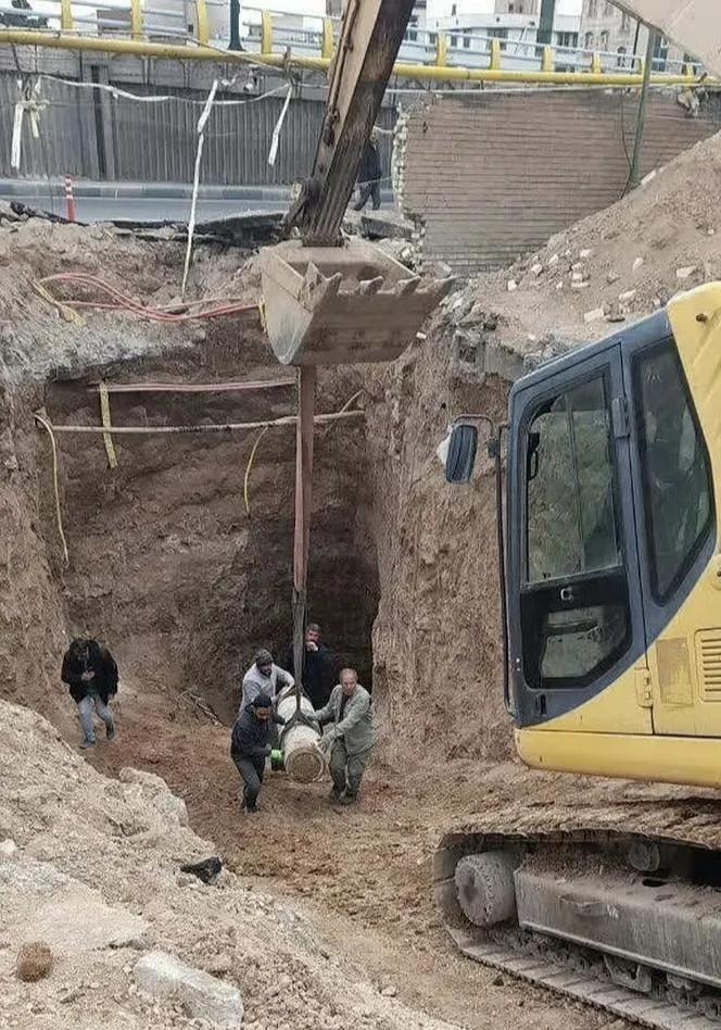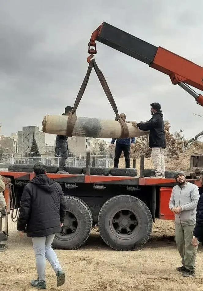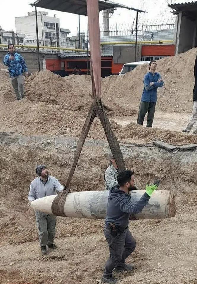 伊朗首都德黑兰,人们齐心合力,清除一枚未爆炸的美军MK84炸弹。引信肯定是先拆了,否则人们也不敢到跟前这样清除。 2000磅的炸弹,也就是908公斤,砸到地面,钻的够深的。
