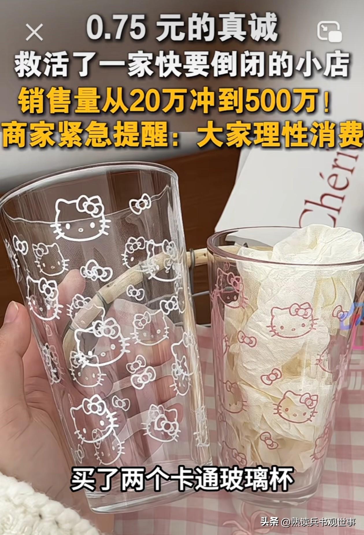 网友好心办坏事,出发点是夸良心商家,却不知给商家带来了大麻烦,首先说故事很有意思,买家收到货后碎了一个杯子,商家本来是要退款解决的,但是因为买家太喜欢这个杯子了,最后就让她补了0.75元,给她补寄一个。 这个事也上了新闻,也受到了热心网友的转发,到此为止,这个事情是蛮正能量的。 但问题是,商家的产品上可是有三丽鸥图样的,原本销量不大,影响一般,这个事也就过去了。 但现在随着网友,媒体的连番炒作,这个事情就上升到了销量很高,影响很大的层面。 大概率商家是要吃官司的,除非拿到了授权。 网友不懂,媒体应该懂得,可惜流量动人心,商家现在必须下架带图样的产品,借着流量果断换品。 不然的话,得不偿失。