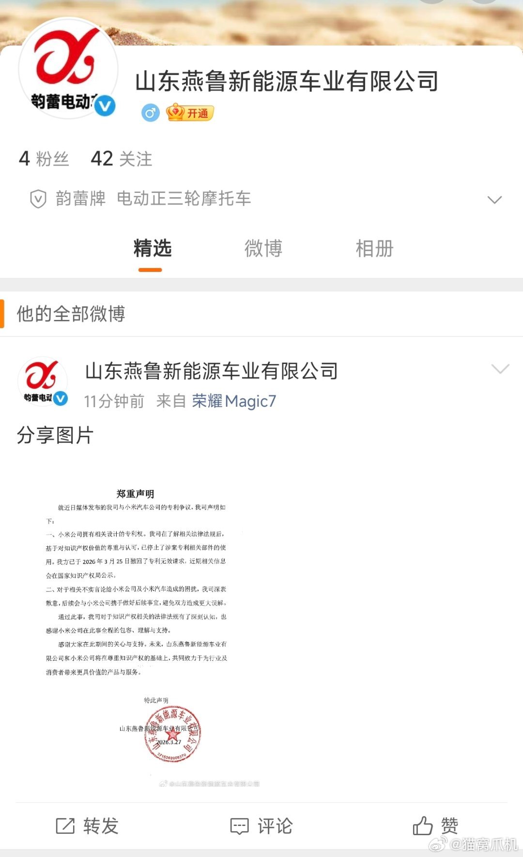 挑战小米专利的老头了厂商注册了微博,发了第一条微博。