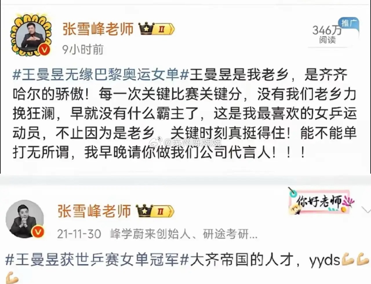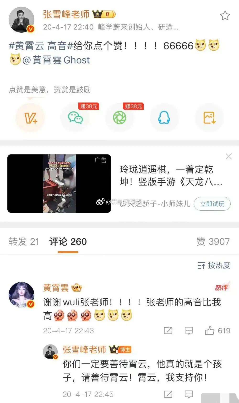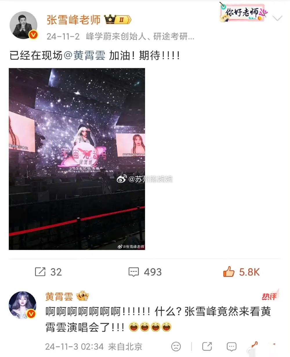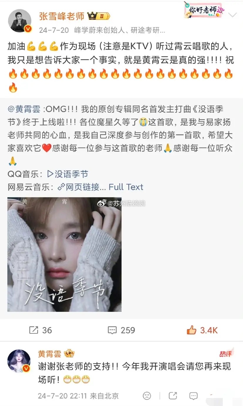 张雪峰去世两天了,按理说黄霄云是不是应该发文悼念一下呢?以为她没有听到这个消息,结果今天她在微博宣传了自己的新歌。看了她写的博文,是我误会她了,她想用新歌表达对张雪峰这位好友的怀念。张雪峰应该是最支持黄霄云的一个公众人物了,在她多次被黑的时候,都勇敢站出来挺她,为她加油打气。我就说嘛,两个这么好的朋友,即便不在网上发也会私下发信息吧。张雪峰喜欢听黄霄云唱歌,黄霄云就唱一首新歌给他听:走过人间一场,愿你如野马、像海浪,奔向一个花开的地方……