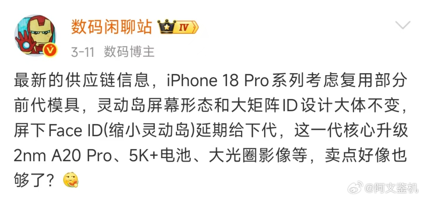 iPhone18的牙膏这就挤不出来了?居然还要复用模具这样的操作,确实,这事也只有苹果才做的出来了。我觉得但凡是一个安卓厂商这么做,肯定会被喷傻。当然如果不说,其实大家也觉得这几年苹果一直都在用差不多的模具。只是你直接改都不改了,那就很离谱了。估计灵动岛缩小一点,然后换个颜色,又是新一代了。