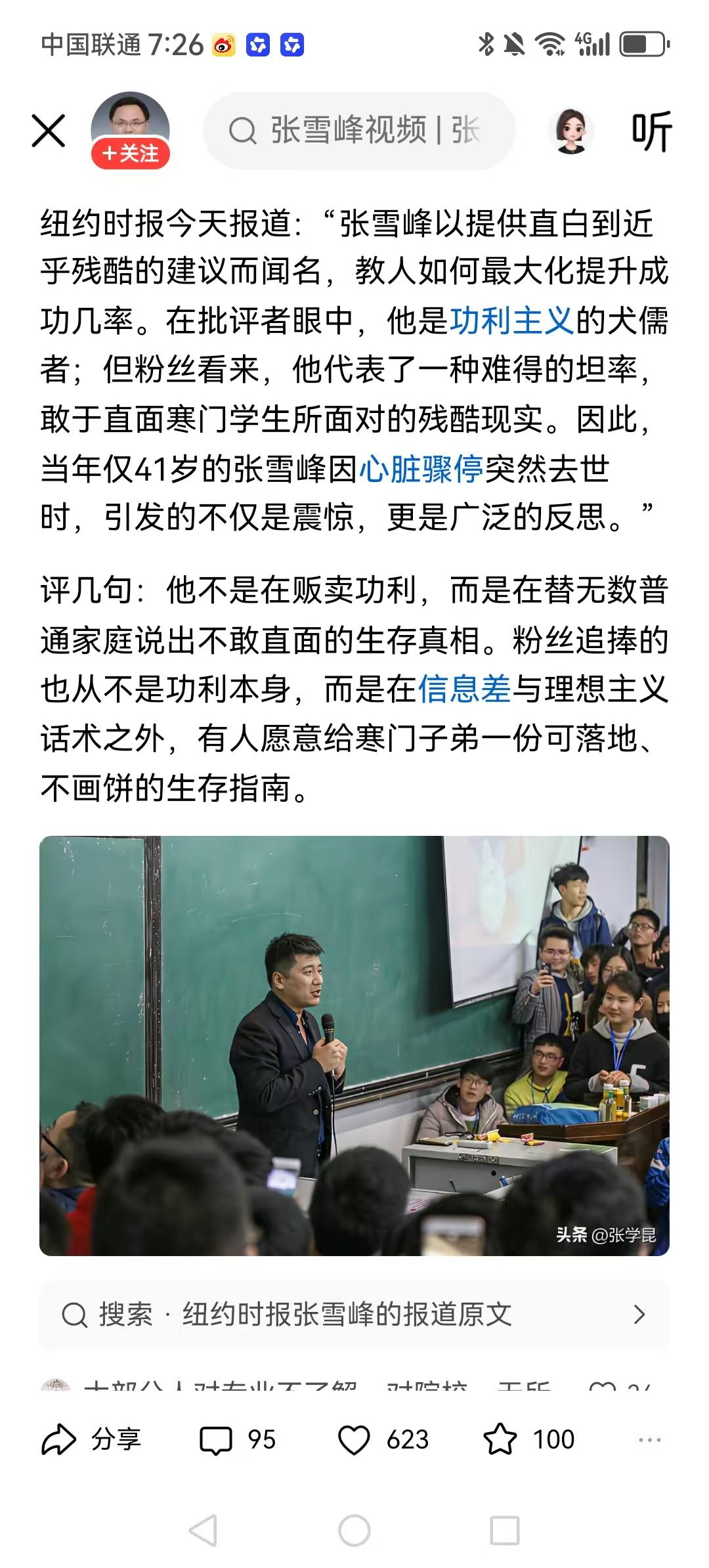 纽约时报今天报道张雪峰!我必须坦率的承认,张老师的确提升了我的认知水平,不只是对于各个高校,也包括对社会和对人性的认知! 张老师给寒门孩子和父母,在坎坷曲折困顿艰辛迷雾重重黑暗的生命之道路上,点了一根蜡烛,使很多寒门人避免掉进沼泽,深坑,救了很多寒门人! 在狼眼里,羊怎么都有罪。报考一个冷门学科,耽误寒门学子一辈子,损失的仅仅是两万块吗? 大部分人对专业不了解,对院校一无所知,他帮了高考家庭。 社会公平与否不应该由获利机构来寻求解决方案,这些机构只会增加社会的卷。 如果不是他科普,我是真不知道学习不好又想上好大学居然除了高考还有那么多捷径可走。 张的说法代表的时代差不多过去了,以后是新的时代来了。 看着他火起来万万没想到还能看到他离去,世事无常。 中国教育是公平的,只是民众的认知,总认为读书就为了当官,赚钱。