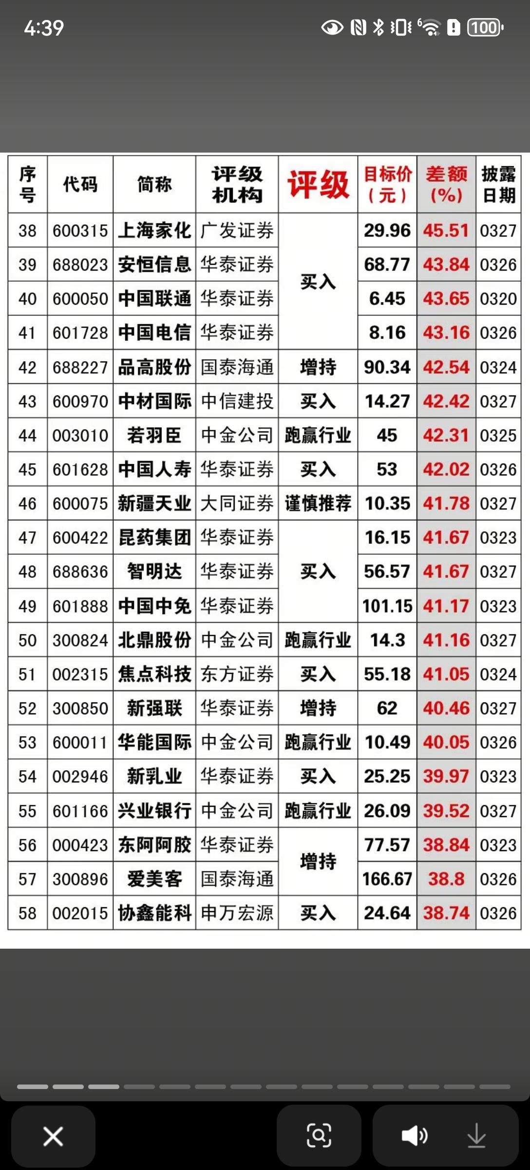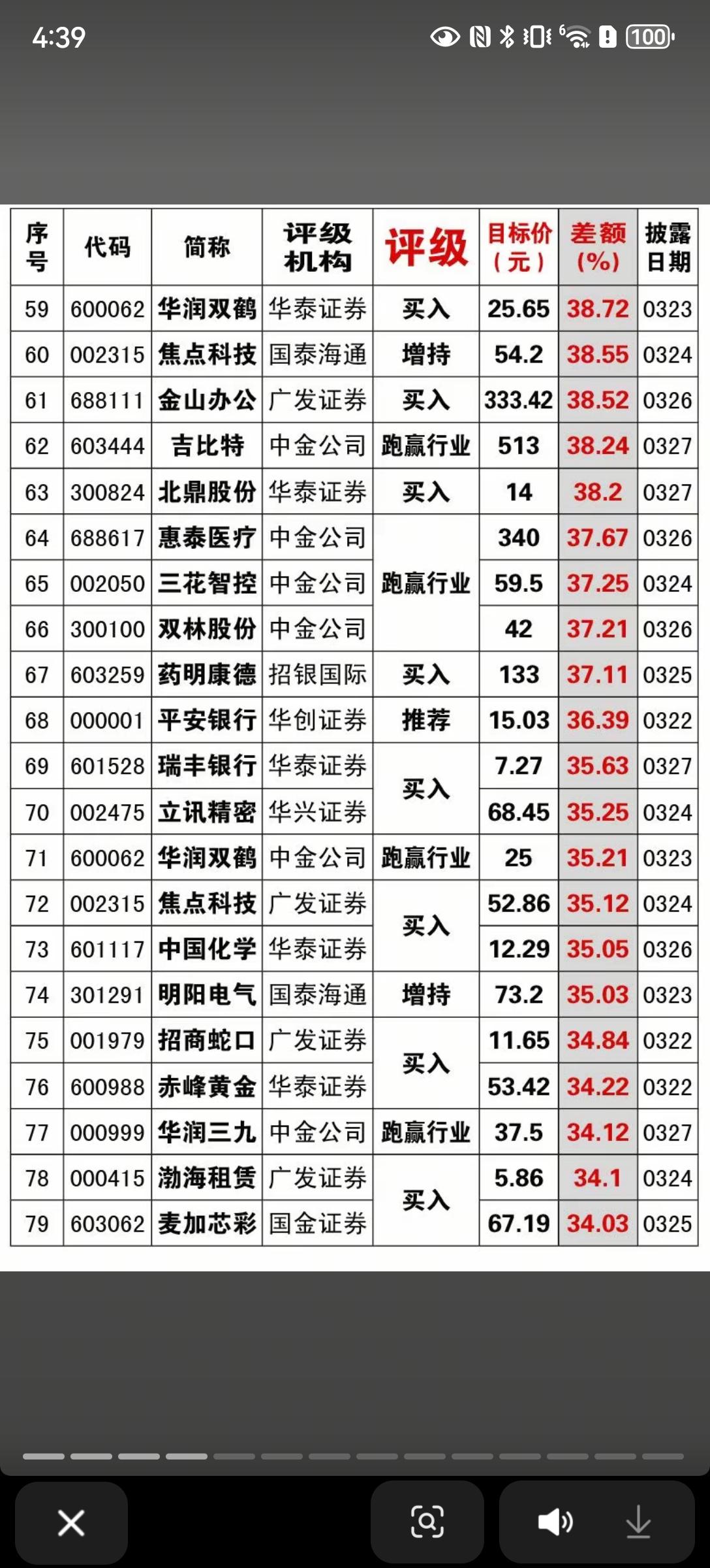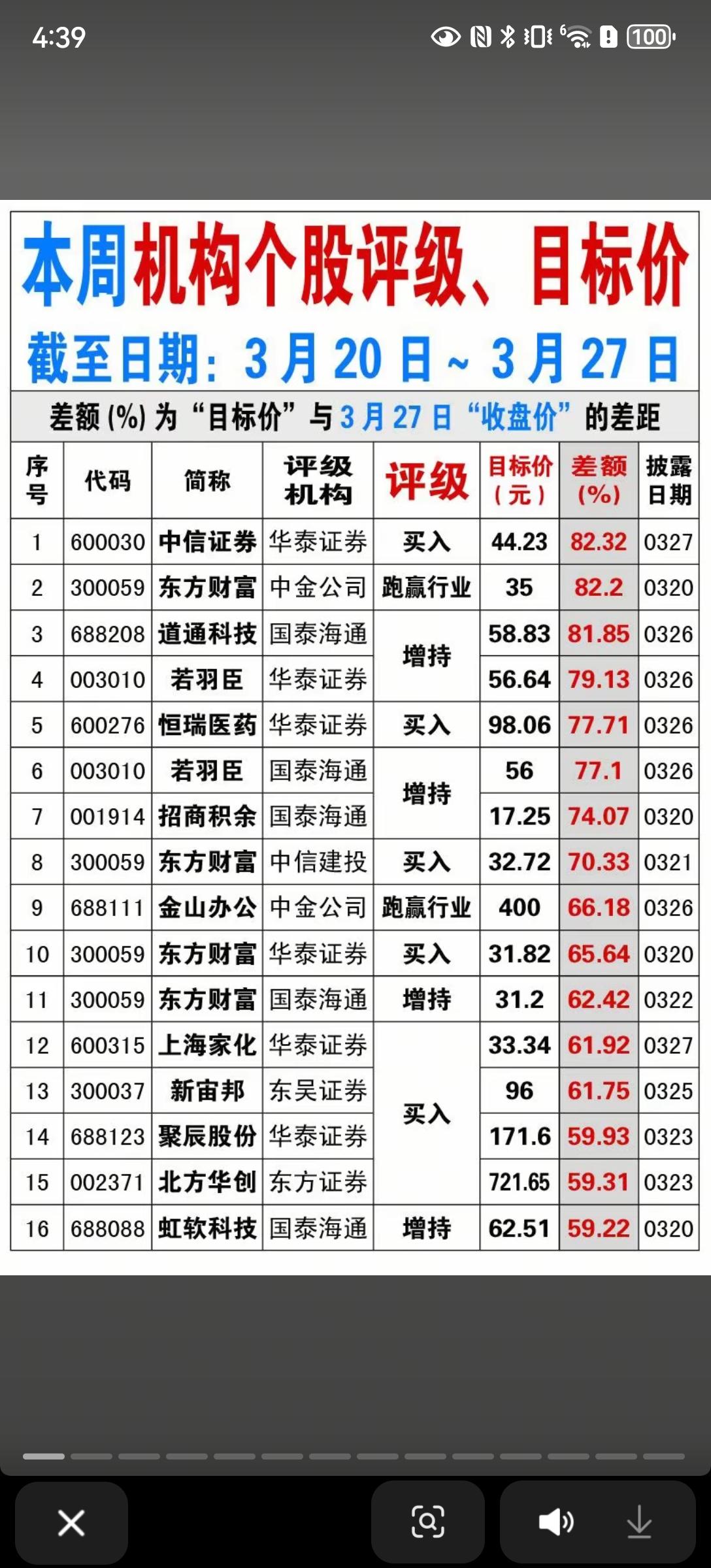 机构个股评级与目标价解析(3.20-3.27) 本周机构评级数据显示,市场对部分个股给出较高上涨预期,头部标的上涨空间超80%。华泰、中金、国泰海通等头部机构评级集中,标的覆盖券商、医药、消费、TMT等多赛道,“买入/跑赢行业”评级占比高,体现机构对核心资产的信心。 东方财富、若羽臣等个股获多家机构联合看好,目标价与现价差额显著,反映其业绩或成长逻辑得到认可。整体来看,机构高预期标的多具备基本面支撑,高差额个股或成为短期资金关注焦点,但需警惕市场波动带来的预期差风险。