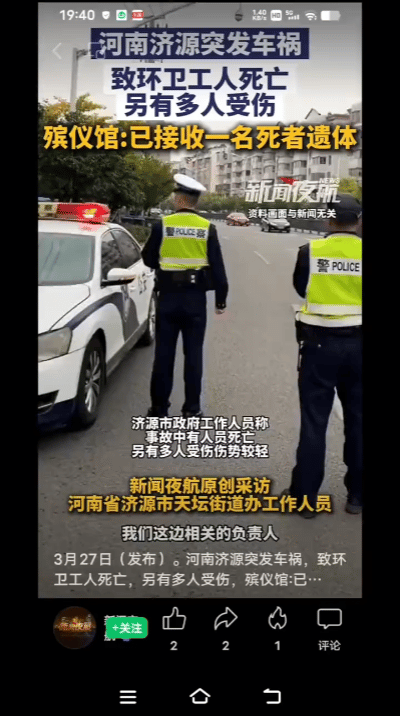 河南济源环卫工街头遭撞身亡,事故始末让人揪心! 一次再平常不过的街头清扫,却成了生命的终点,这场发生在河南济源的悲剧,看得人满心揪心。2026年3月26日上午9时许,城区核心主干道上,一场突发车祸,让一名环卫工人永远离开了他坚守的岗位。 事发地位于济源济水大街与太行路交叉口,这里是城区车流往来的核心路段,虽说早高峰已过,但路面上依旧车流量极大,往来车辆接连不断、行驶不停。遇难的环卫工和往常一样,在路口开展日常清扫作业,专注打理着路面的卫生,全然没察觉到危险正在靠近。 毫无征兆间,路口突发多车相撞的交通事故,正在作业的环卫工毫无防备,面对疾驰而来的车辆根本来不及躲闪,当场被撞身亡。这场意外还波及了其他同事,另外3名环卫公司工作人员在事故中受伤,所幸伤势较轻,没有生命危险。 周边商户和过往路人目睹惨剧后,第一时间拨打了报警和急救电话。急救人员火速抵达现场,经现场检查,确认被撞环卫工已无生命体征,3名受伤人员随即被送往医院接受治疗,目前伤势平稳,无生命危险。 当地交警、街道办等部门工作人员也迅速赶赴现场,开展现场秩序处置、事故勘察工作,同时耐心安抚遇难者家属情绪。截至目前,肇事车辆具体信息、事故发生的详细原因,警方仍在进一步调查中。 济源环卫工被撞身亡 守护环卫工生命安全春日生活打卡记 看到这样的悲剧,你认为环卫工作业时最需要哪些安全保障?