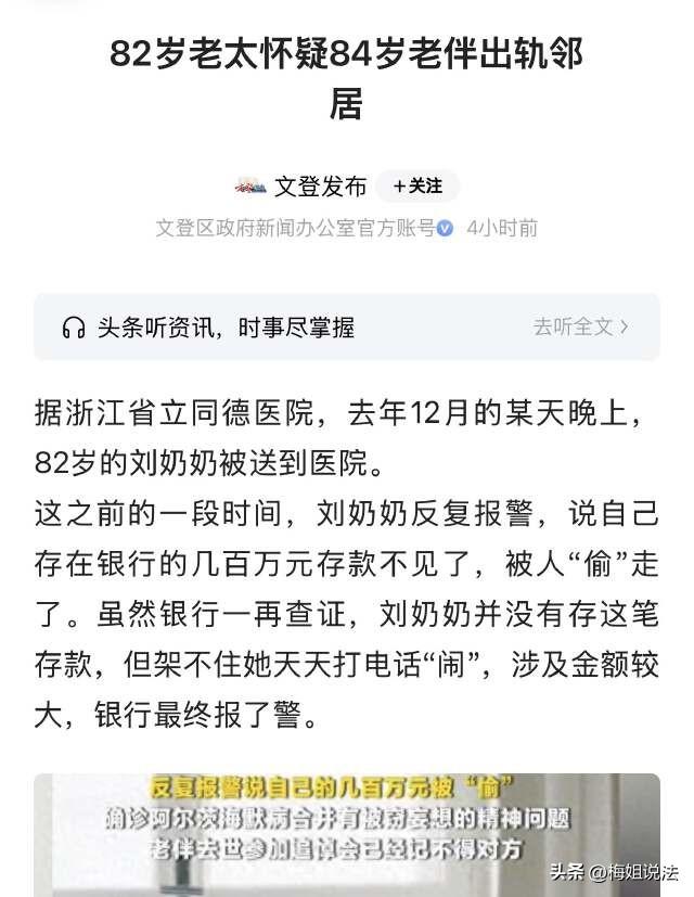 浙江,一位82岁的老奶奶最近怀疑一件事,那就是她总是感觉她那84岁的老公,可能跟邻居老太太好上了。第二天,老奶奶就跑去跟邻居吵架,一番闹事后,还用拐杖把自己老公的头砸出一个口子。回家后,老奶奶又报了警,说自己几百万元的存款不见了,被人给偷走了。相关人员立刻介入调查。 文登发布3月27日报道了这则新闻。 很多人比较介怀自己的另一半,就生怕他会背叛自己的感情,这样的念头一直存在自己脑海里,时时刻刻就会心生怀疑:他到底有没有背叛我。 所以,即便到老了,八九十岁了,即便老年痴呆了,在她脑海深处,还是会被记忆烙印一件事:他外面没人吧? 刘奶奶就是这样的人,时年82岁的她,还在深受情感的折磨。 这一天,刘奶奶在家做家务,突然就对着自己84岁的老公发难:“我看到你跟隔壁邻居眉来眼去的,你是不是喜欢上她了?” 虽然老伴儿听了感觉很扯,但是还是极力在反驳:“怎么可能,你可别乱怀疑了。” 谁知道,即便丈夫很耐心的在解释,刘奶奶还是不甘心,直接就跑到隔壁邻居家,跟隔壁家的老太开始吵架。 不仅这一天吵架,自此之后,刘奶奶几乎是天天跑到隔壁邻居家,天天跟人家老婆闹,非说自己老公的外遇,就是她。 有一次,就在争执不下的时候,刘奶奶的丈夫上前劝架,没想到刘奶奶直接就拿起拐杖,朝着老伴儿的头砸去...... 丈夫的头,直接就被砸出一个小口子了。 虽然丈夫疼的“嗷嗷”叫,丝毫没有唤醒刘奶奶的理智,她的嘴巴里还是在念头:“你就是背叛我了,你就是跟她好了。” 后来,在稍微太平了一段时间之后,刘奶奶又整幺蛾子了。 刘奶奶在家翻找抽屉,突然就用手机报了警,说柜子里的存折不见了,里面还有几百万的存款。 办案人员接报之后,立刻就赶到刘奶奶家里来查案。 刘奶奶则坚持一口咬定,自己的几百万存款被人给偷走了,这可是她这一辈子的积蓄啊。 可是办案人员、结合银行的工作者,一直在核对流水,发现刘奶奶根本就没有这些存款,几乎全是刘奶奶自己胡乱编造的。 刘奶奶可不答应,之后的每一天,她都打电话给银行,天天去闹,说是银行给弄丢了她的存款,非要讨说法。 银行也招架不住,也只能再次报了警。 后来经过一番核实,发现刘奶奶的情况不大对劲,似乎是一直在编造故事,完全沉浸在自己的世界里。 而且刘奶奶的老伴儿也说,晚上她也不睡觉,一直跟自己说:钱没啦,被偷走了啊! 去医院诊断一番后发现,刘奶奶被确定为阿尔茨海默病合并有被窃妄想的精神问题,病症已经进展到中度,之后要干预就比较难了。 另外,在刘奶奶住院治疗期间,她的老伴儿也离世了,刘奶奶的女儿带她去参加了追悼会,回来后,女儿问她:“我们今天去看了谁啊?” 而刘奶奶却一脸茫然,连摇头都费劲了,她几乎完全不能记得任何人了。 像刘奶奶这样的情况,是否需要承担法律责任呢? 一般情况下,患有老年痴呆的、82岁的老太太,因为精神状态异常报假警,不需要承担刑事责任。 但是如果她的精神状态尚佳,并且可以辨认行为发生的状况,仍然可能需要承担部分法律责任。 根据《刑法》规定,精神病人在不能辨认、或者不能控制自己行为时造成危害结果,经过法定程序鉴定并且确认的,不需要承担刑事责任。 本案中的老太太,在行为的时候因为自己患有老年痴呆,已经完全丧失了辨认能力,出现被迫害妄想症、而且还认知错乱,属于无刑事责任能力人,依法不需要承担刑事责任。 如果行为能力正常,如果报假警、或者袭击他人,则要承担法律责任。 根据《治安管理处罚法》第25条规定,报假警、或者存在殴打他人的情况,会依法处理,一般处以5-10日的行政拘留或者罚款。 而面对刘奶奶这样的情况,也只能教育家属,让他们加强看护,家属需要尽到监护的责任。而不是说去处罚刘奶奶本人,只能说,尽量避免类似事件再次发生。 老人家年纪大了,子女亲属的陪伴也很重要。 对此,你怎么看?