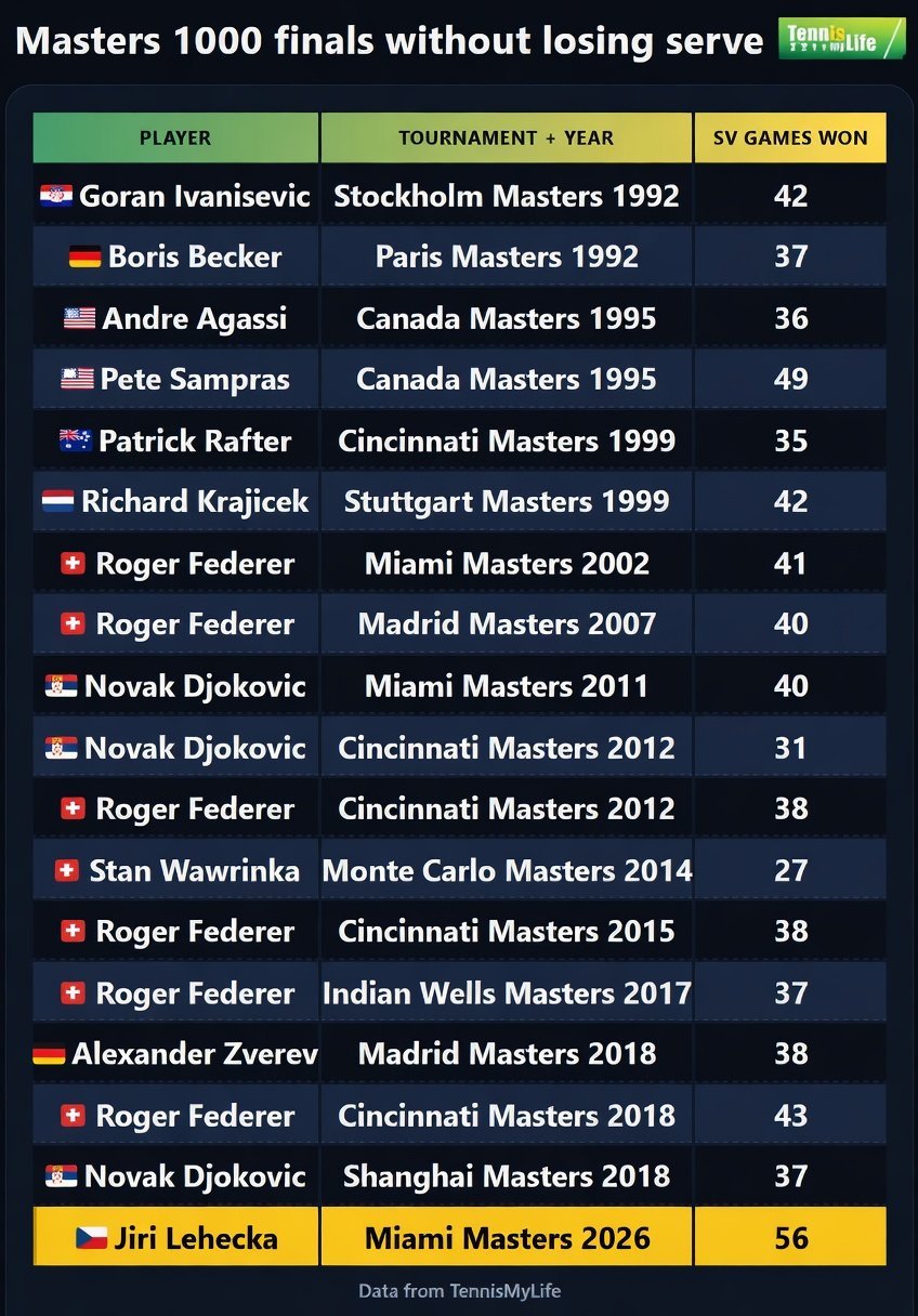 一个恐怖数据:莱赫卡本站连保56个发球局,未被破发打进决赛,为大师赛历史之最。