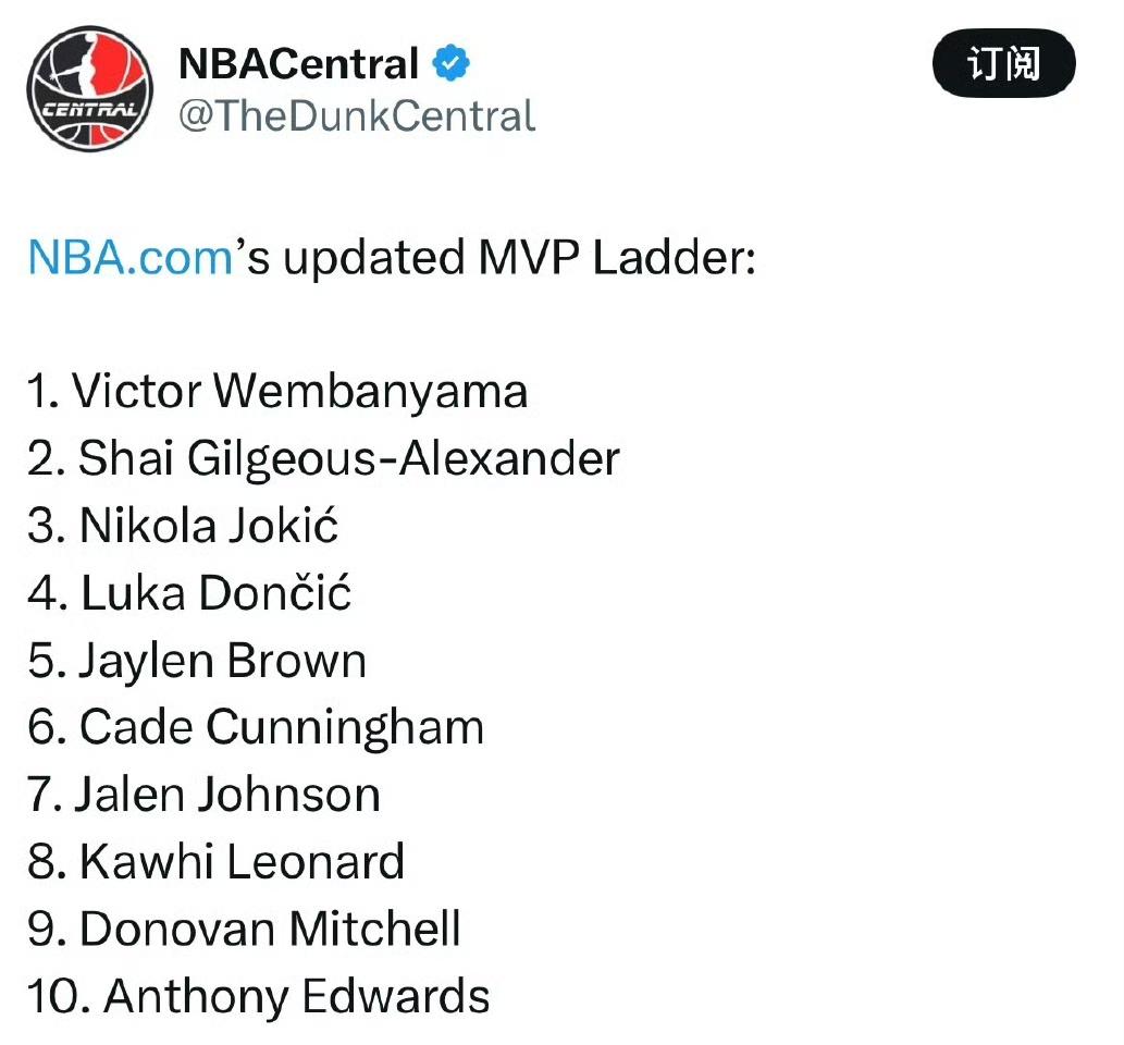 3月27日,NBA官网公布最新一期MVP榜单,马刺新星文班亚马反超亚历山大升至榜首。 此前,亚历山大已经连续9期霸占榜单第一的位置,这次直接被挤到了第二。约基奇、东契奇和杰伦·布朗,分列三到五名。 没人能想到,收官阶段的MVP榜首,会以这样的方式易主。 要知道,亚历山大本赛季场均能拿31.5分4.4篮板6.6助攻,效率稳居联盟前列,带队成绩一直稳在西部上游,连续两个多月的榜首,早就给人一种“稳了”的错觉。 可文班亚马,硬是用实打实的表现,把这个榜首抢了过来。 本赛季他场均24.2分11.2篮板3.1盖帽,盖帽数稳居联盟第一,最近三场比赛就送出17记封盖,场均不到30分钟的出场时间,就能打出攻防两端的统治级表现。 更狠的是,他带着马刺最近25战赢下23场,从之前的重建队伍,直接冲到了西部争冠行列。 一个22岁的年轻人,生涯第三个赛季,就站到了联盟MVP榜单的最顶端。 我不觉得这是MVP之争的终局,亚历山大的实力依然在线,约基奇、东契奇这些老牌强者也还在紧追不舍。 但文班亚马的这次登顶,已经给这个赛季的MVP悬念拉到最满。比起最终谁能拿奖,这种年轻人敢冲敢拼、硬生生打破格局的劲头,才是篮球最动人的样子。