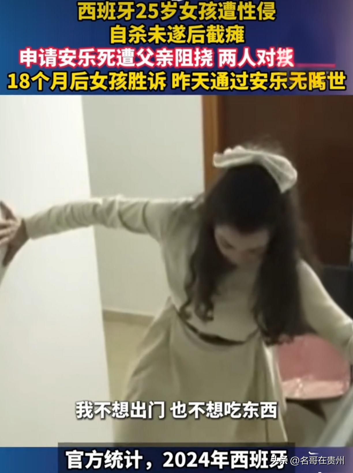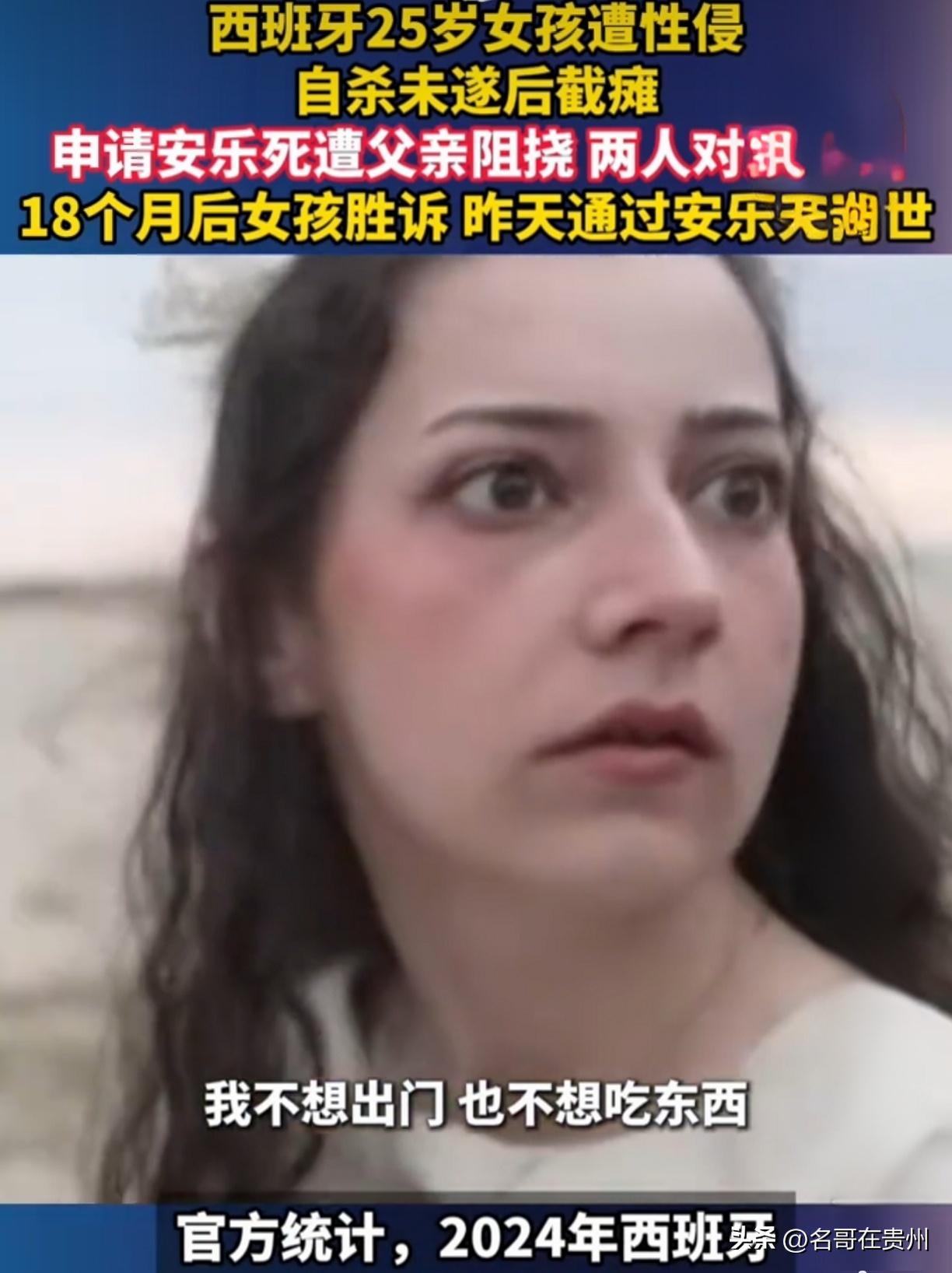 25岁女孩瘫痪求死,亲爹却把她告上法庭!结局让人心碎 哎,今天看到一个新闻,心里堵得慌。西班牙一个25岁的女孩,走了,是用她自己最想要的方式,安安静静地离开了。但这条解脱的路,她走得比谁都难,难到要和自己最亲的人对簿公堂。 这个女孩叫玛丽亚(化名),她的人生,用“地狱模式”来形容都不为过。几年前,她遭遇了性侵,那场噩梦彻底摧毁了她。巨大的心理创伤让她选择了从楼上跳下去,命是救回来了,可人却再也站不起来,终身截瘫。 你能想象吗?从一个活蹦乱跳的年轻姑娘,到被固定在轮椅上,连基本的生活都无法自理。身体的痛苦、心理的创伤,双重折磨下,玛丽亚觉得活着只剩下煎熬。于是,她做了一个决定——申请安乐死。在西班牙,安乐死是合法的,但这需要经过严格的审批。 原本以为这会是一场自己跟命运的告别,没想到,第一个站出来反对她的,竟然是她的亲生父亲。 这位父亲,死活不同意。他说他爱女儿,他相信会有奇迹,他不能眼睁睁看着女儿“杀死自己”。他不管女儿每天承受着怎样的痛苦,也听不进女儿无数次“我想解脱”的哭诉。为了阻止玛丽亚,他做了一个让所有人都震惊的举动——把女儿告上了法庭。 亲生父亲,把已经瘫痪、一心求死的女儿,告上了法庭。 这场官司,一打就是漫长的18个月。一边是女儿渴望结束痛苦的决绝,一边是父亲“为你好”的固执。法庭上,女孩坐在轮椅上,神情平静但眼神里全是疲惫;她的父亲站在对面,表情复杂,有愤怒,有不舍,更多的是一种无法沟通的固执。他们之间,隔着的不是法庭的走廊,而是一道永远无法逾越的亲情鸿沟。 这场关于“爱与痛”的拉锯战,最终,法院判玛丽亚胜诉。她获得了安乐死的合法权利。 胜诉的那一刻,玛丽亚是什么心情?是终于可以解脱的释然,还是对亲情彻底死心的绝望?我们不得而知。我们只知道,在拿到判决结果后不久,玛丽亚平静地执行了安乐死,永远地闭上了眼睛。 你说,这到底是谁的悲剧?是女孩的,她本该有绽放的人生,却被一场暴行彻底改写。也是父亲的,他用自以为是的爱,把女儿最后的尊严和选择权,变成了一场公开的审判。 有人说,这位父亲是爱女儿的,只是方式错了,他不忍心放手。也有人说,这种爱太自私了,他爱的是“女儿活着”这件事,而不是女儿这个人,不是女儿的真实感受。 真正的爱,到底是拼死挽留,还是尊重对方的选择,哪怕那个选择是告别? 玛丽亚走了,留给我们的,是一个关于亲情边界、关于生命尊严,沉重到无法呼吸的问题。你觉得,这位父亲的做法,是爱吗? 作者申明: 本文内容根据西班牙媒体《国家报》(El País)及多家国际媒体报道综合整理。