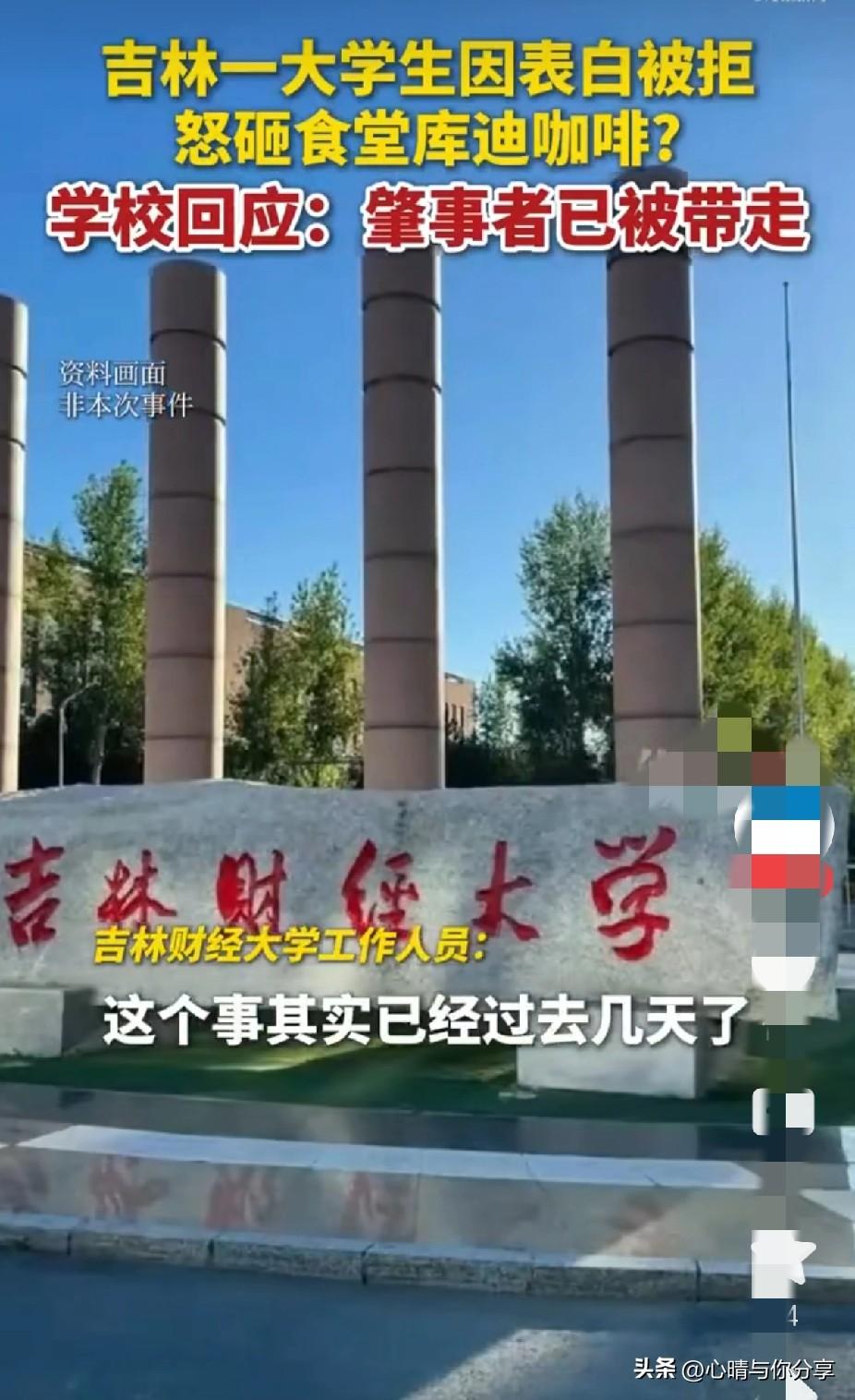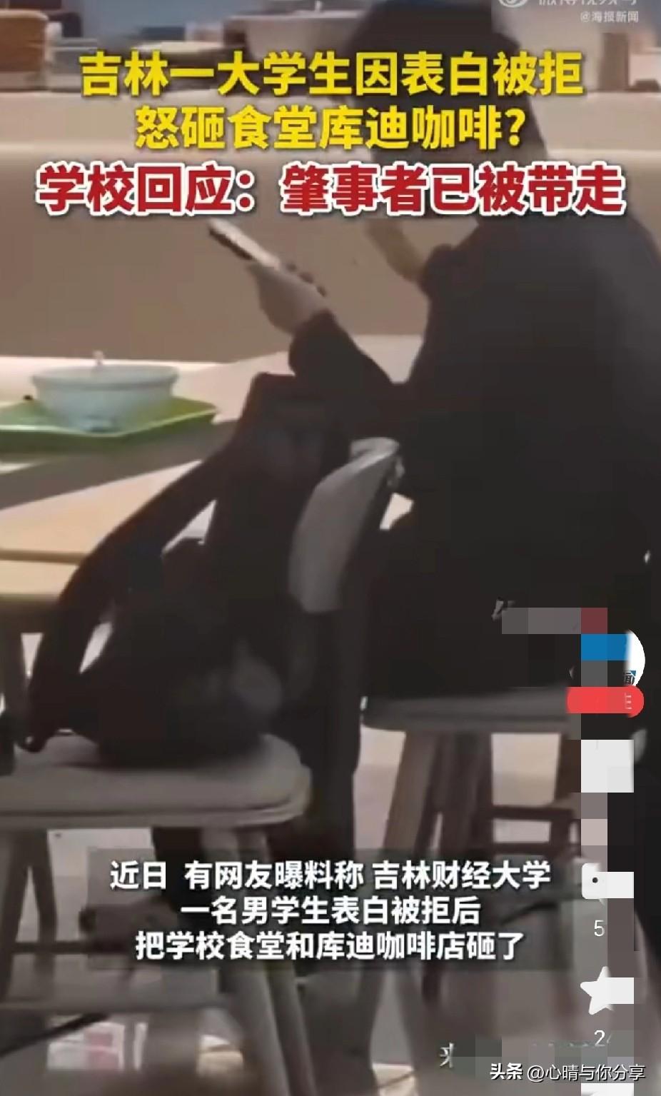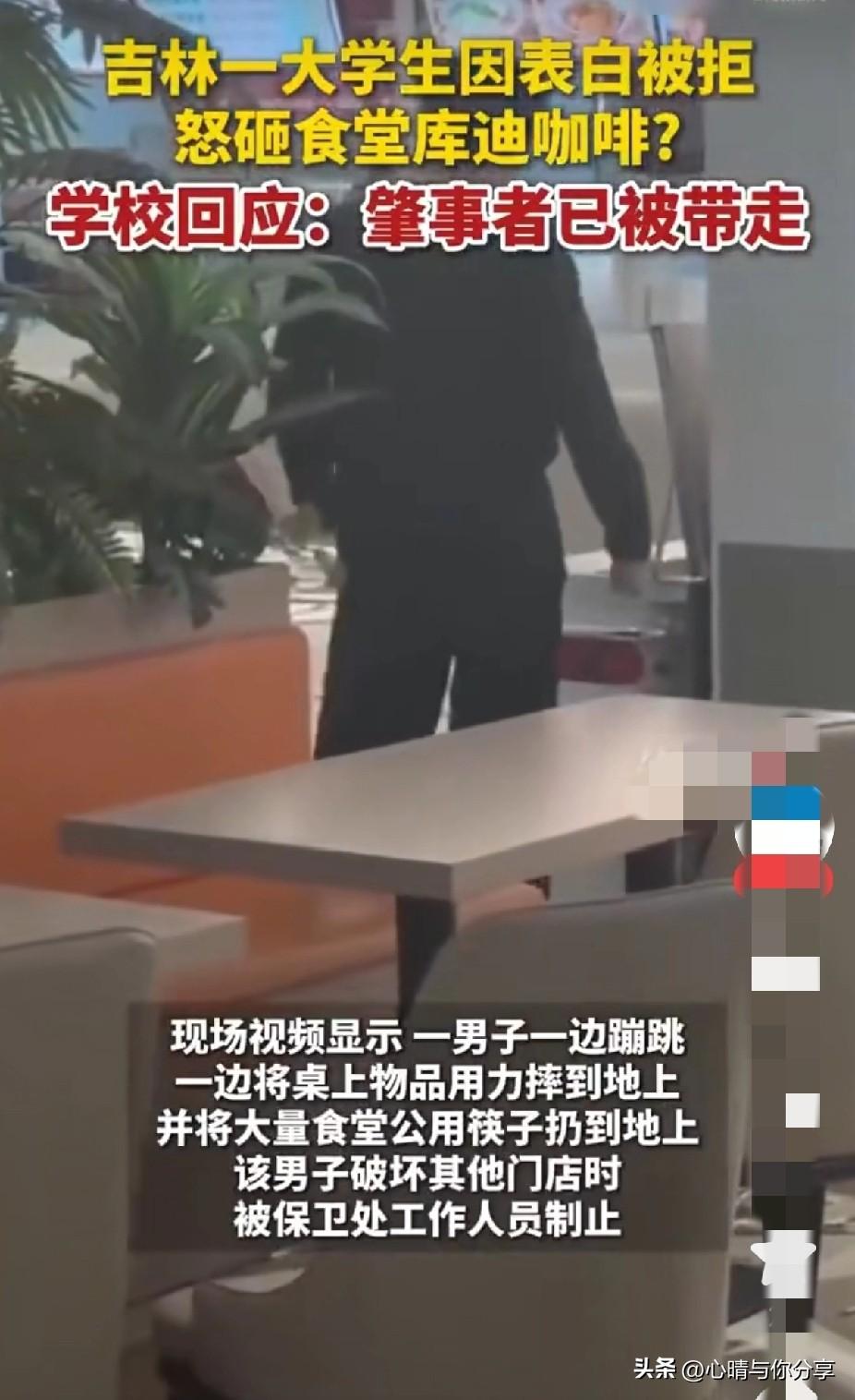 真替这位女生感到庆幸, 幸亏没有答应表白,不然以后还不知道会发生啥呢? 3月24日,吉林财经大学一男生因表白被拒后,怒砸学校食堂咖啡店,被保安带走,造成损失约15万元,引发热议! 女生的选择是明智的,这样的男生,明显是有暴力倾向的,脾气暴躁的人,怎么适合过日子呢? 一点不顺心就打砸东西,没有一点成年人的理性,一看就是被家长惯坏了的熊孩子! 你可以爱别人,别人也可以拒绝被爱!但是在这个男生心里,显然就是不能被拒绝!没有霸道总裁的命,却得了霸道总裁的病! 以后还是擦亮眼睛吧,离这种人远点,也不要给这种人一丝希望,不然后悔都会来不及! 且行且珍惜吧,大学还是以学业为主吧! 大家觉得呢?