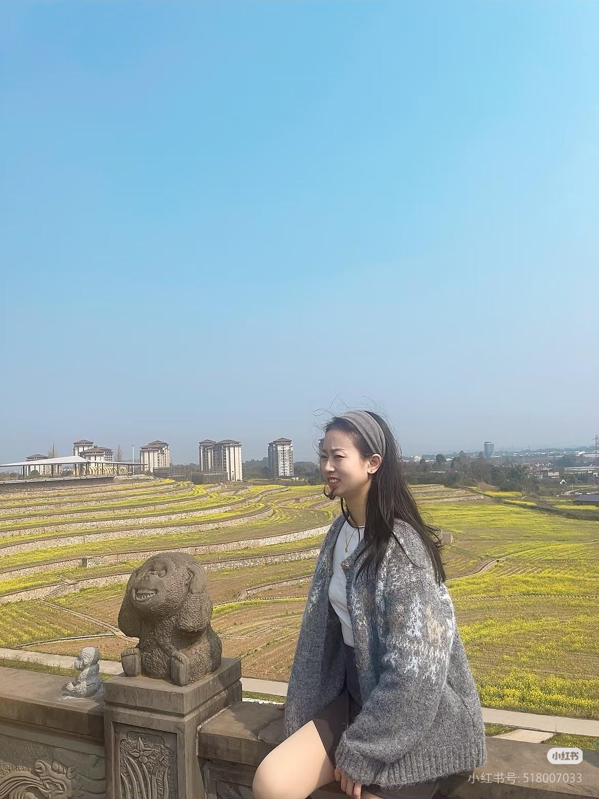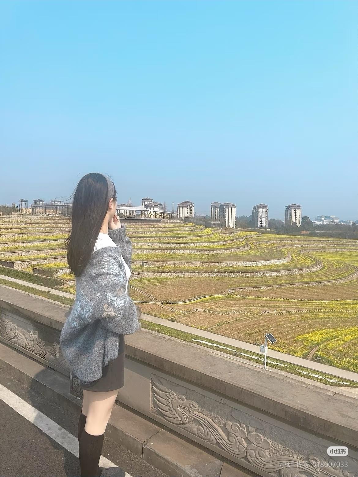 俯瞰花田,少女背影,春日暖阳