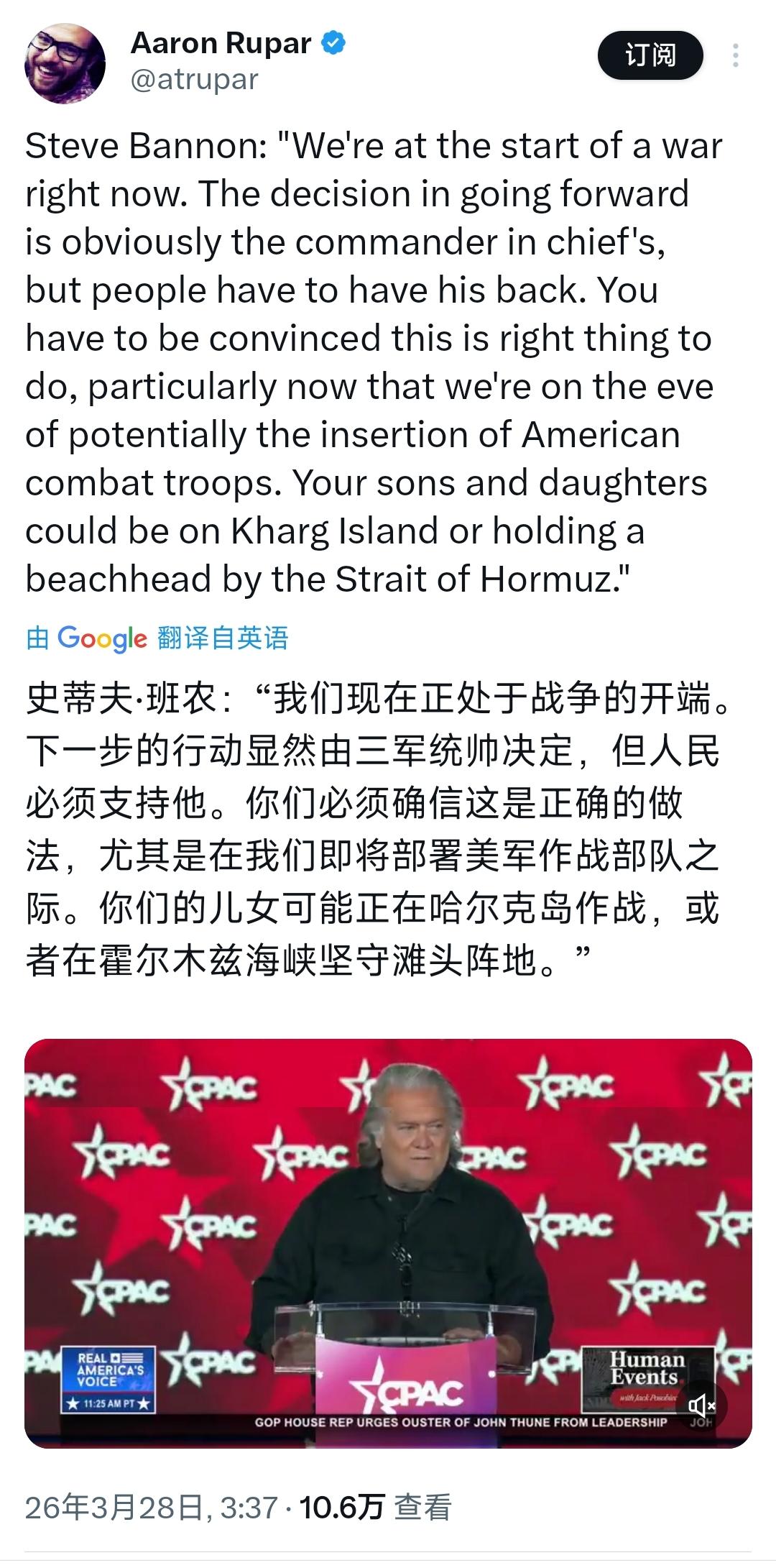 特朗普的前政治顾问史蒂夫·班农今天(北京时间3月27日)在保守派政治行动会议(CPAC)上表示:"我们现在正处于战争的开端。下一步的行动显然由三军统帅决定,但人民必须支持他。你们必须确信这是正确的做法,尤其是在我们即将部署美军作战部队之际。你们的儿女可能正在哈尔克岛作战,或者在霍尔木兹海峡坚守滩头阵地。" [机智]评几句:班农又在保守派会议上疯狂鼓噪战争,叫嚣美军即将奔赴哈尔克岛与霍尔木兹海峡作战,还逼迫美国民众支持这场不义之战,这番狂热言论恰与美国主流民意背道而驰。近六成美国民众认为对伊军事行动过火,超六成反对派遣地面部队,高油价与战争焦虑早已让民众怨声载道。但班农的鼓噪绝非个人臆想,其作为特朗普核心政治盟友,此番言论实则是替特朗普释放战争信号,而美军正持续向中东集结两栖作战部队、部署夺岛兵力的行动,更印证这正是特朗普的真实意图,他全然无视民意与战争风险,只为一己政治私利将美国和全球拖向冲突深渊。