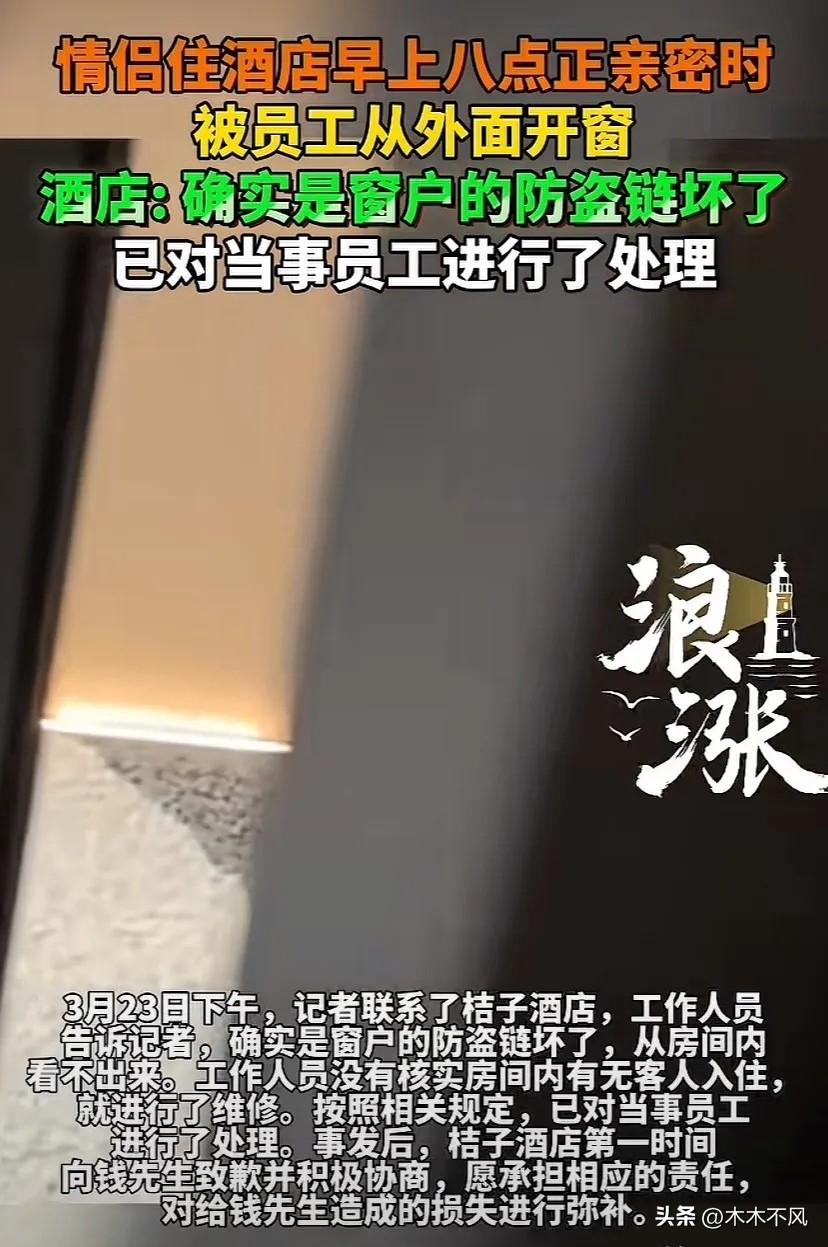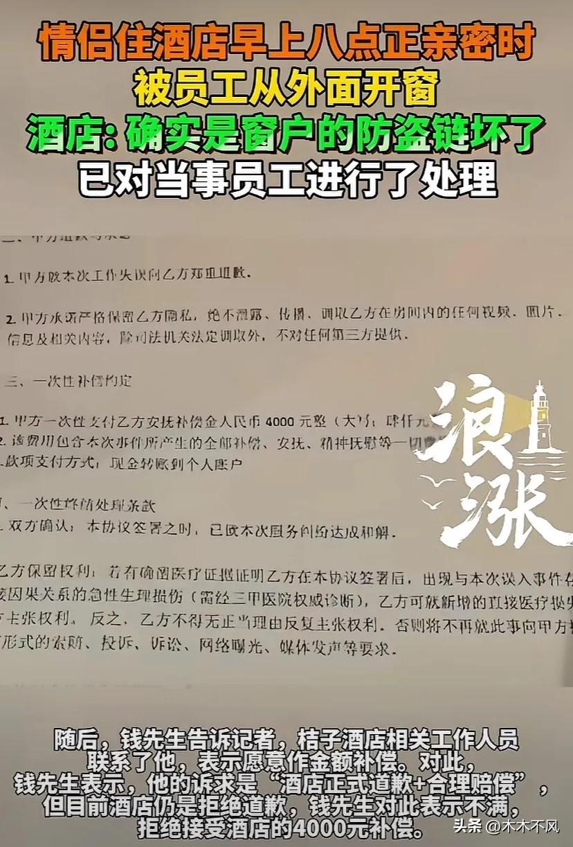 “太欺负人了!我们正在运动!”南京,男子和女友在酒店亲密活动,早上8点半维修工突然开窗闯入 “我正在床上和女友亲密,窗户突然被人从外面打开了!” 钱先生回忆起那个早晨,至今仍觉得又羞又气。 前不久,钱先生和女友入住了南京某酒店。房间在负一层,窗户朝着一条封闭走廊。 3月15日早晨8点半左右,钱先生正和女友在房间里亲密活动。突然,窗外传来一阵刺耳的电钻声。他扭头一看,一个人影正在窗外,试图打开房间的窗户! 钱先生当场被吓得够呛,连忙大声喝止。可对方像是没听见一样,手上的动作根本没停。 他又急又气,赶紧联系酒店前台。直到前台打电话过去,窗外的人才离开。 事后,钱先生越想越不对劲,找酒店讨要说法。 酒店告诉他,那是维修工,受酒店安排来修窗户的。可钱先生检查了窗户,根本没看到哪里有损坏。 “就算是维修,是不是应该提前通知我一声?而且早上8点多,正是住客休息的时间,招呼都不打一个就开窗,这算怎么回事?” 钱先生认为,维修工的行为严重侵犯了自己和女友的隐私,要求酒店赔礼道歉并赔偿损失。协商无果后,他向12345等部门进行了投诉。 《民法典》第1032条明确规定,自然人享有隐私权。任何组织或者个人不得以刺探、侵扰、泄露、公开等方式侵害他人的隐私权。私人生活安宁、不愿为他人知晓的私密空间、私密活动,都属于隐私范畴。 酒店作为经营场所,未尽到安全保障义务,擅自安排人员维修房间窗户而不提前通知住客,确实侵犯了钱先生及其女友的隐私权。他要求道歉和赔偿,是正当权益。 3月17日,在相关部门协调下,钱先生提出:赔礼道歉,另赔偿4000元。 酒店方面表示愿意赔偿,但拒绝道歉。更过分的是,他们还拿出一份协议,要求钱先生签字,承诺放弃投诉、诉讼等合法权利。 钱先生觉得,赔偿是其次,关键是酒店得认识到错误,向自己和女友正式道歉。他拒绝了酒店的条件。 让他没想到的是,隔天酒店态度大变——之前的协商诚意荡然无存,只同意退还一晚房费。 钱先生气不过,将此事曝光给记者。 记者联系酒店核实情况,对方回应称,窗户的防盗链确实坏了,从里面看不出来。维修工没有核实房间内是否有人就开工,确实不对,他们已经处理了涉事员工,也第一时间向钱先生道歉并协商补偿。还表示会继续沟通。 可当记者再次联系钱先生时,钱先生说,酒店后来提出给4000元补偿,但依然拒绝出具正式的道歉。 “我就是咽不下这口气。”钱先生拒绝了补偿,决定维权到底。 事情曝光后,网友议论纷纷。 “早上8点半,住客还在房间,不敲门不问一声就开窗?这操作也太离谱了。” “赔钱了事不道歉,这是什么逻辑?做错了事连句对不起都说不出口?” “酒店这态度,不是诚心解决问题,是想花钱买闭嘴吧。” 从法律上讲,酒店确实理亏。赔礼道歉和赔偿损失是两种不同的责任承担方式。酒店只愿给钱不愿认错,说白了还是没把住客的尊严当回事。 挨打就要立正。错了就是错了,该道歉就道歉,这是最基本的担当。 酒店若始终抱着“给钱就能了事”的态度,不敢正视错误、不愿低头认错,寒的是钱先生的心,毁的是自己的口碑。 钱先生拒绝4000元补偿,只为一个正式的道歉——这份较真,值得尊重。 这事您怎么看?欢迎在评论区聊聊。