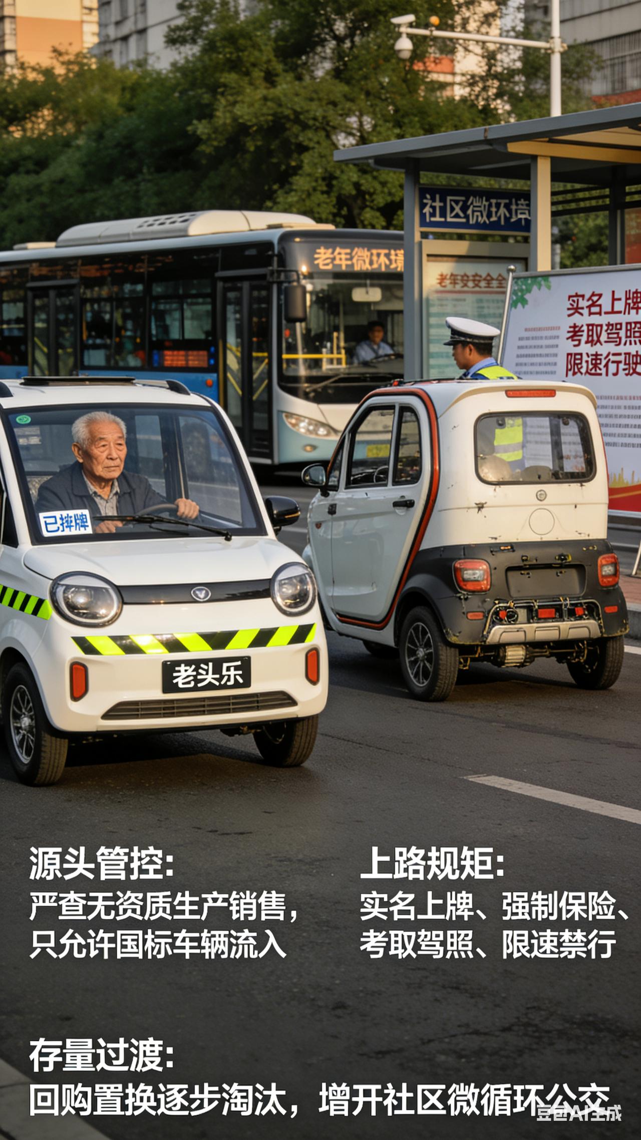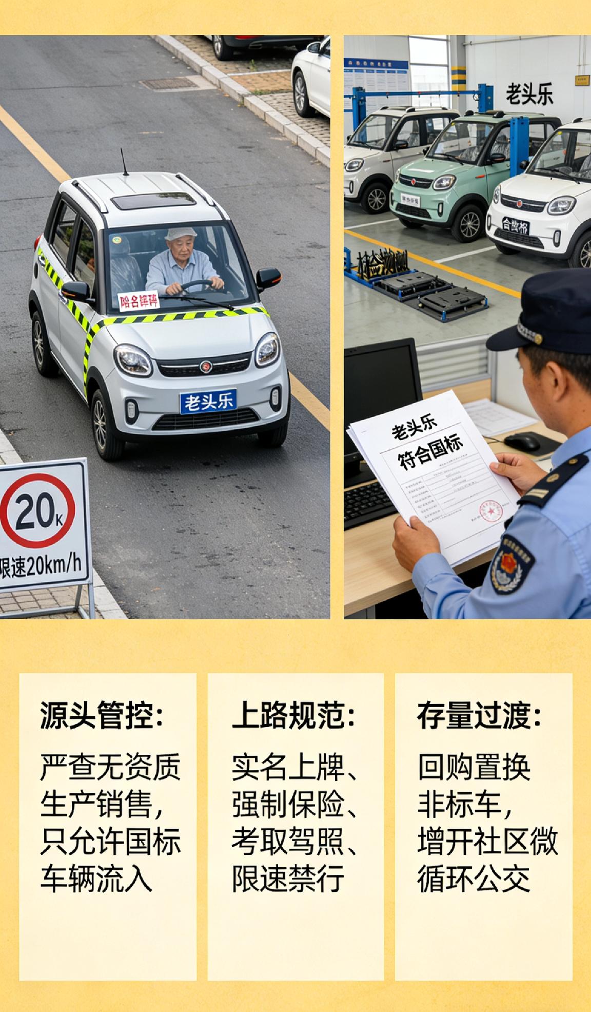 “老头乐”解决了老人短途出行难题,但无牌无证、乱行闯红灯、安全系数低,隐患突出。规范不能简单禁行,要兼顾安全与民生。 源头要管住,严查无资质生产销售,只允许符合国标的车辆流入市场,杜绝超标改装。上路要立规矩:实名上牌、强制买保险,驾驶人需考取对应驾照,明确限速与禁行路段,不允许驶入主干道。 对存量非标车设置合理过渡期,用回购、置换逐步淘汰。同时补齐便民出行短板,增开社区微循环公交,做好老年交通安全宣传。 管得住、行得稳、有替代,才能既守好道路安全,也照顾好老年群体的出行需求。(个人观点) 道路交通安全 老头乐治理