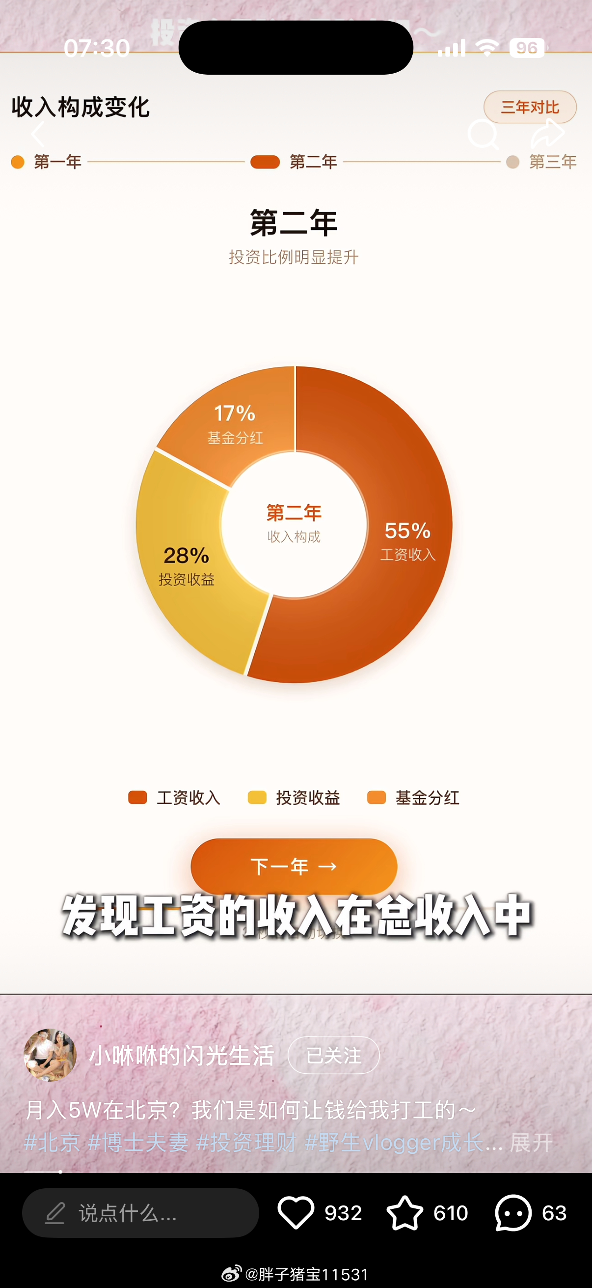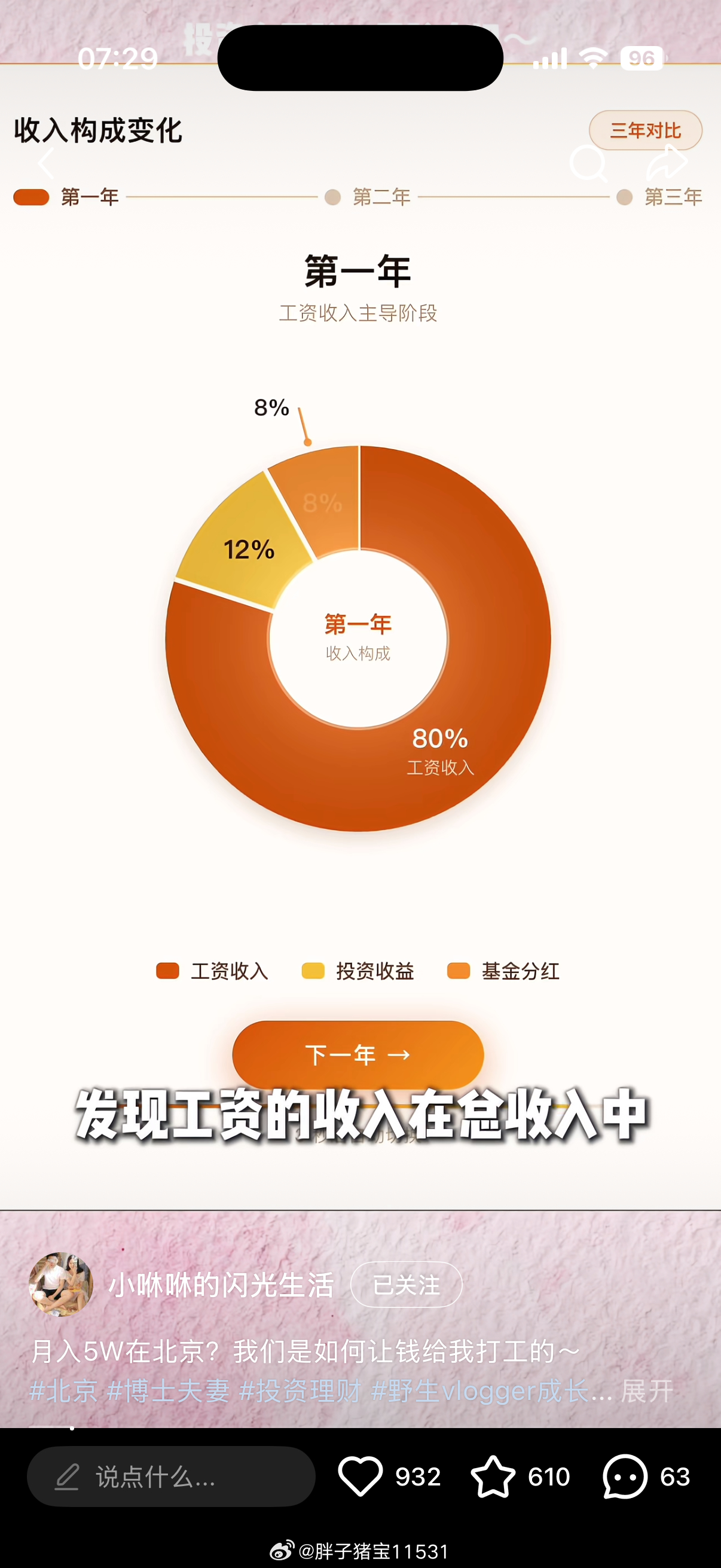 看小咻咻做了几年博主清华双职工的工资收入占比已经是30%了,这样就是失去劳动性收入,短期生活也不会有什么波动的我之所以心里就是没安全感,除了穷过,很多时候有不配得感,再就是家里大部分的收入来源就是工资,我刚才去看了一眼,3个月工资收入占比82%,这真的是不敢停下来的原因。基本上和小咻咻家第一年的情况差不多。可惜我也不敢高风险投资。
