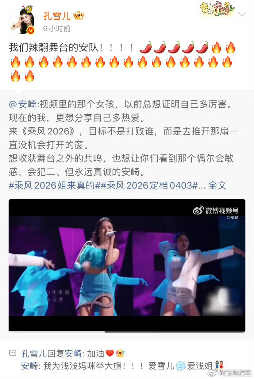 安崎回复孔雪儿 THE9成员隔空互动再+1!孔雪儿为参加《乘风2026》的应援后,安崎回复:我为浅浅妈咪举大旗!。从成团到各自发展,女团成员们跨时空为彼此的重要作品互相支持,为彼此的人生加油鼓气。乘风2026
