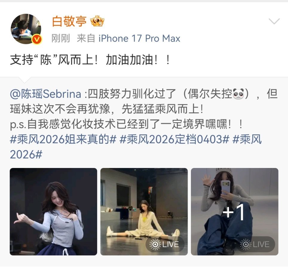 白敬亭给陈瑶乘风2026打call小白给陈瑶浪姐打call了!宣传委员来啦!也期