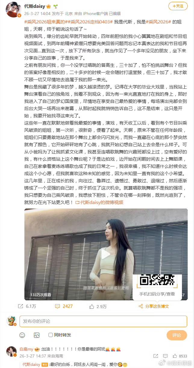 《乘风2026》终于等来代斯官宣加盟,惊喜感直接拉满! 暖心好友白鹿第一时间现身为力挺加油,谁的童年回忆又回来了?两人曾塑造的白烁与阿妩深入人心,情谊满满。 一句鼓励愿阿妩勇敢奔赴舞台,在人间肆意发光闯荡,期待代斯绽放别样魅力,坐等她惊艳全场的初舞台!
