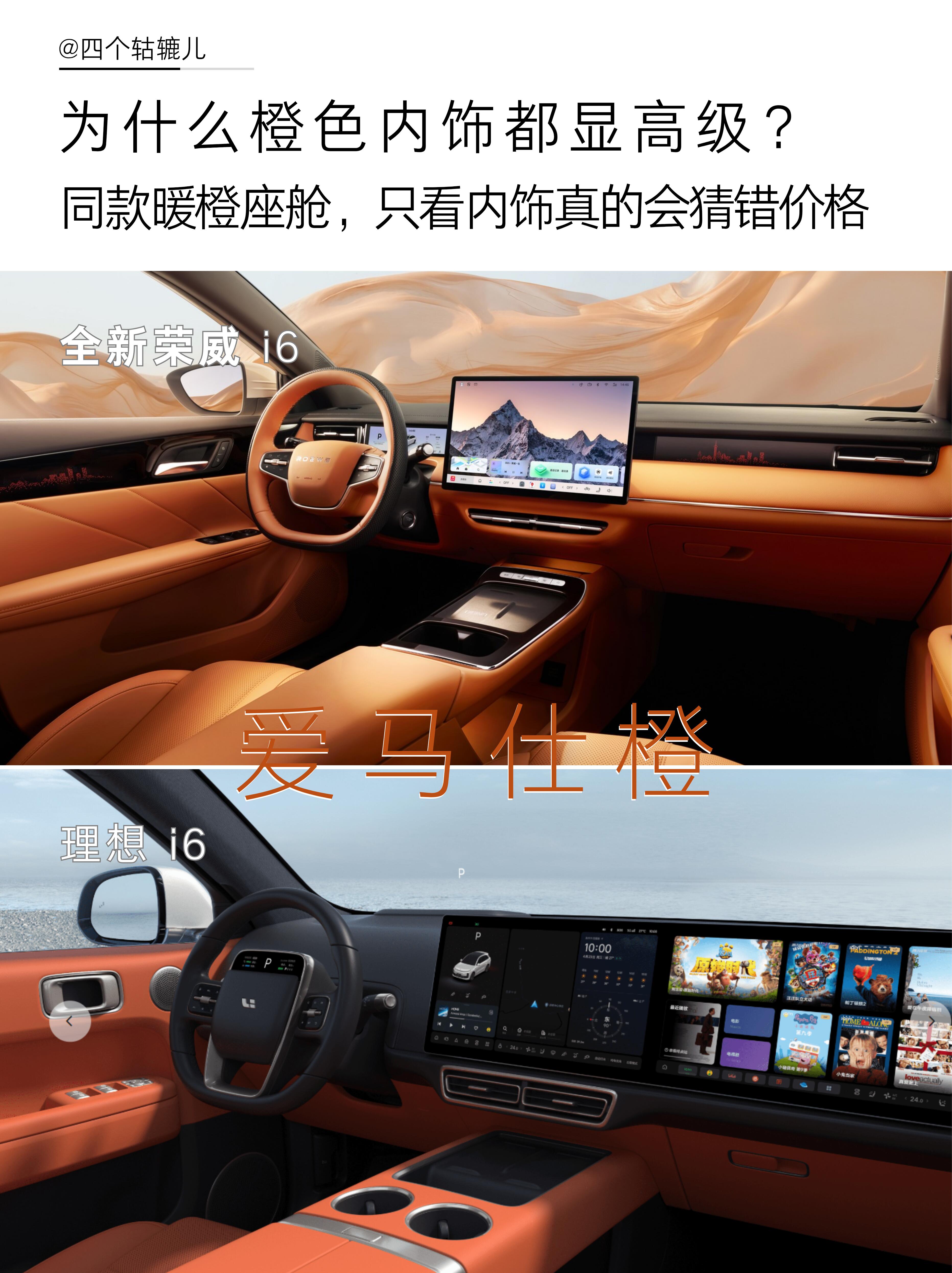 像理想i6那一套橙色,当时很多人第一次看到都会觉得:原来内饰还能做得这么有质感、有记忆点。 所以我前两天刷到全新荣威i6的时候,第一反应其实是:这个价位,也开始做橙色了?饱和度刚好的暖橙色内饰,还有细腻的软包工艺,说实话第一眼我还以为是哪台二三十万级的旗舰新车,结果没想到是台主打亲民家用的车型,完全打破了我对入门家用车的固有印象。 - 直接说重点:内饰质感横评 我这次是带着“对标理想i6”的预期去看的,结果还挺有意思的: 理想i6:它的橙色内饰简直是完美主义,豪车橙加大屏,很容易就让人喜欢上。 全新荣威i6:它的橙色内饰官方还给起了个非常吉利的名字——“心想事橙”,近十平方的软包面积紧实细腻,在门板上还搭配了点阵纹理和精致缝线,中控部分配了 15.6 英寸的 2.5K 高清大屏无线充电面板、前排分层储物区这些日常高频使用的配置也都配齐了,好看的同时,实用性也完全没落下。 以前总觉得,几万块的家用车,主打就是一个实用够用,在设计、质感和舒适度上,大多只能将就。毕竟预算摆在这,很难兼顾体面和实用大家也常说 “这个价位还要什么自行车”。但全新荣威i6真的就在内饰上下足了工夫。 咱就说,哪个i6内饰更让人爱喽? - 除了内里,全新荣威i6颜值同样走的是豪华路线。 大尺寸前格栅加上直瀑式设计,光轨日行灯,形成极具辨识度的前脸语言,有种劳斯莱斯的稳重感,也有种新能源汽车的现代感,简洁中还带着点灵动。 - 最后一个总结 如果把理想i6当作橙色内饰的一个“标杆”,那荣威i6这次,其实是把这个东西往一个更亲民的区间做了一次延伸。另外据说,这台荣威i6的价格可能会落在7-9万这个区间,如果真是这个定价,那豪华车橙色内饰的“门槛”确实被拉得很低了,这台车大概率会挺有讨论度的。全新荣威i6将在4月份上市,有家用车预算的不妨观望一下。 这波“两个i6”的对比,确实挺有意思的。