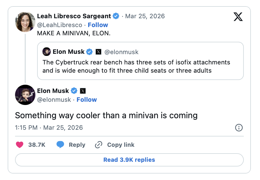 特斯拉似乎正在考虑推出一款新车,以满足大家庭的需求。鉴于粉丝们多年来一直呼吁推出这款新车,而特斯拉也正在逐步淘汰其唯一的家用大型车Model X,现在看来或许正是推出这款新车的绝佳时机。 马斯克在回复网友评论时透露,公司正在研发一款新车,这款车将“比MPV酷炫得多”。 特斯拉曾在2024年的“We, Robot”大会上发布过一款大车Robovan。不过正在研发的可能是一款类似CyberSUV的车型,这款车足够大,可以容纳大家庭出行。 如果特斯拉真推出一款大型SUV,会不会又卖爆?