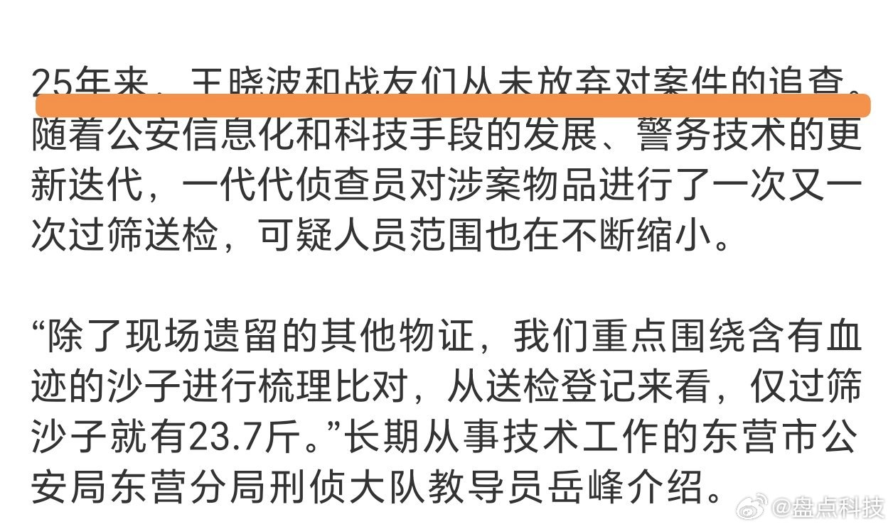 警方过筛23.7斤血沙破25年前命案从25年前的证据固定并保护,到25年后新一代技术侦破案件,体现了25年前的那批刑侦人员的未雨绸缪的睿智;