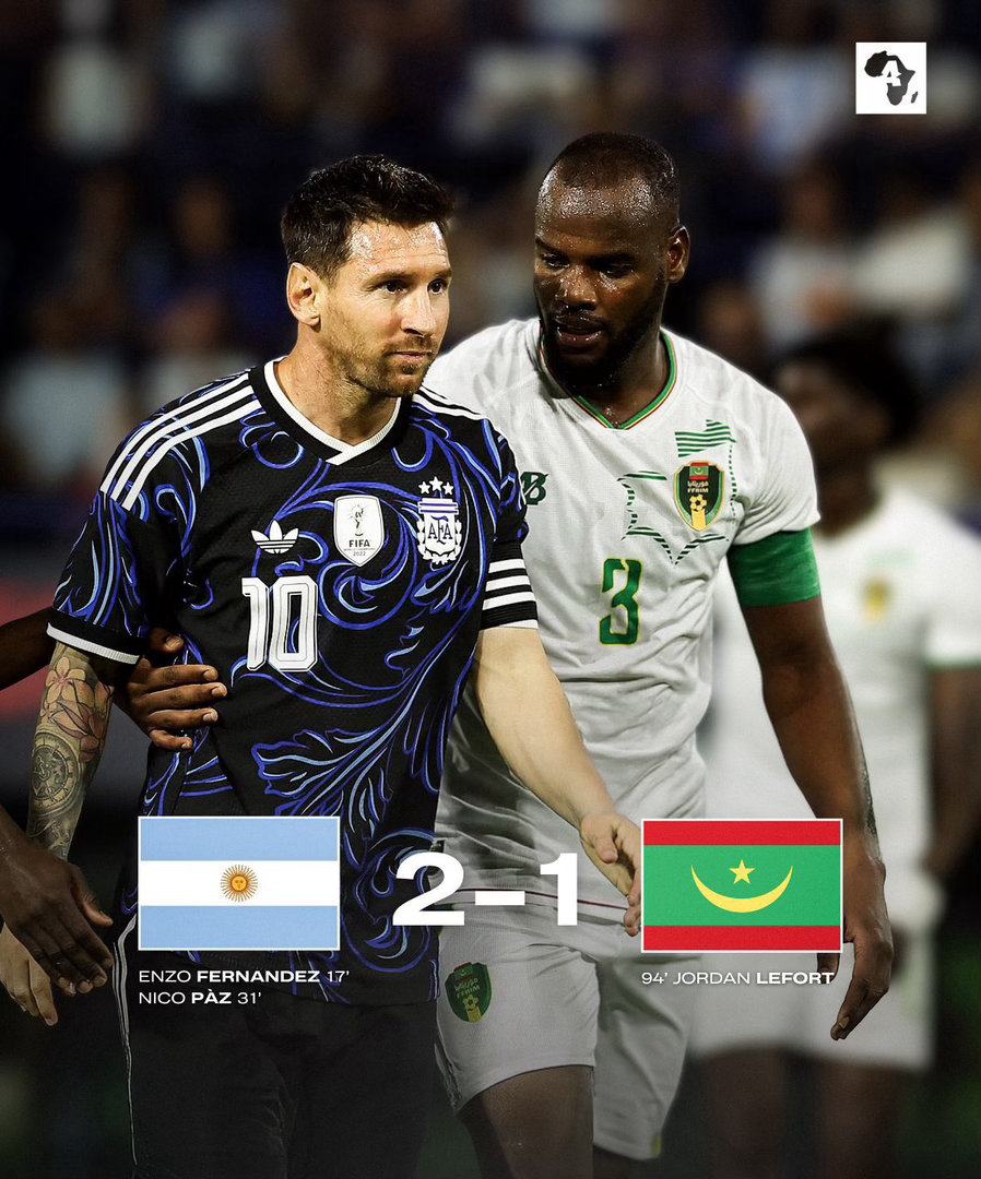 🚨点评:阿根廷2比1毛里塔尼亚 上半场莫利纳助攻恩佐先拔头筹,尼科帕斯任意球打入个人国家队首球。下半场阿根廷队替换多名球员,补时阶段毛里塔尼亚扳回一球。全场比赛结束🇦🇷阿根廷2比1毛里塔尼亚🇲🇷