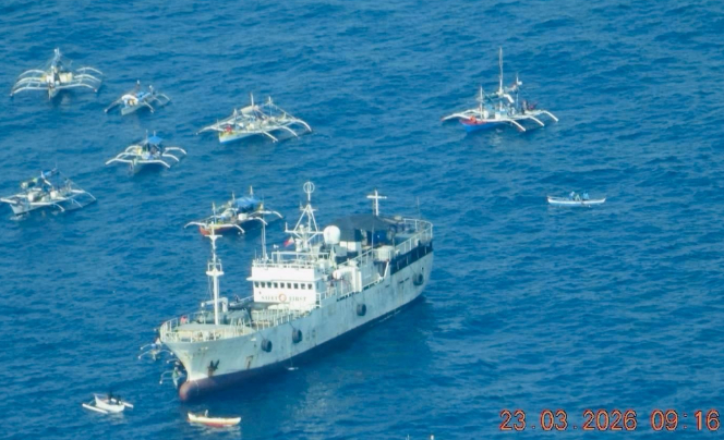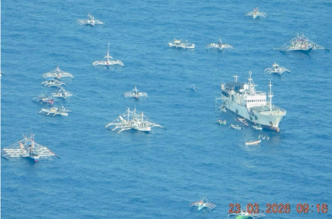 据菲律宾海警部门及当地主流媒体ABS-CBN的报道,自2026年3月21日起,菲律宾方面组织了一场规模空前的海上行动。在黄岩岛以东约30海里的海域,菲方非法聚集了超过20艘渔船,并在其侧翼部署了2艘44米级的大型海警艇以及6艘渔政执法船,试图通过“人海战术”强行。