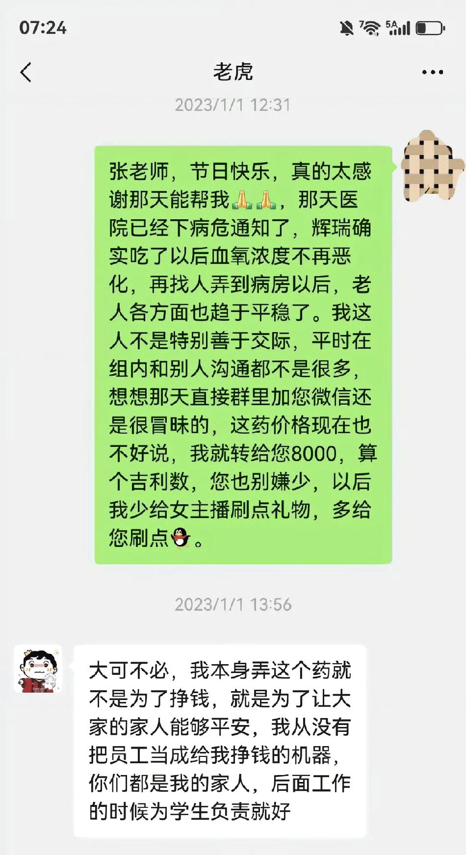 说张雪峰是网红并不贴切,他更像是互联网时代的大侠。 仗义,直爽,对朋友好,对员工好,对客户好。 有员工亲人病危,买不到药,从公司大群加他微信,向他咨询。 他不仅没拒绝,还大方送上了价值8000的药,救了老人一命。 员工给他💰,他回复的这段话,完全展现了他侠义的一面, “不用给我钱,我买这个药不是为了挣钱,而是为了让你们的家人都平安,你们都是我的家人,只要工作中把学生服务好就行。” 可惜啊,他帮了这么多人,在他最需要帮助的时候,身边却没一个人。 令人唏嘘难过……