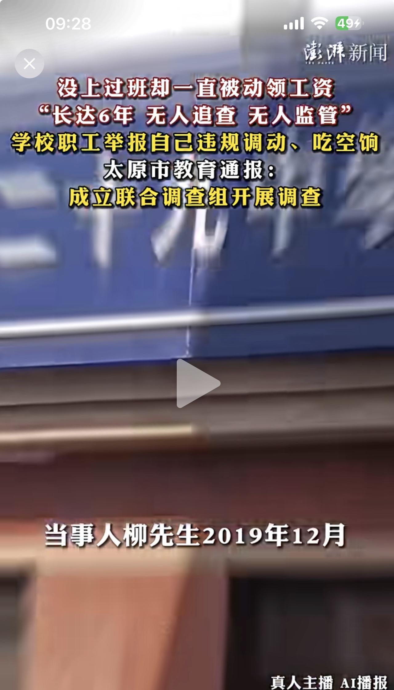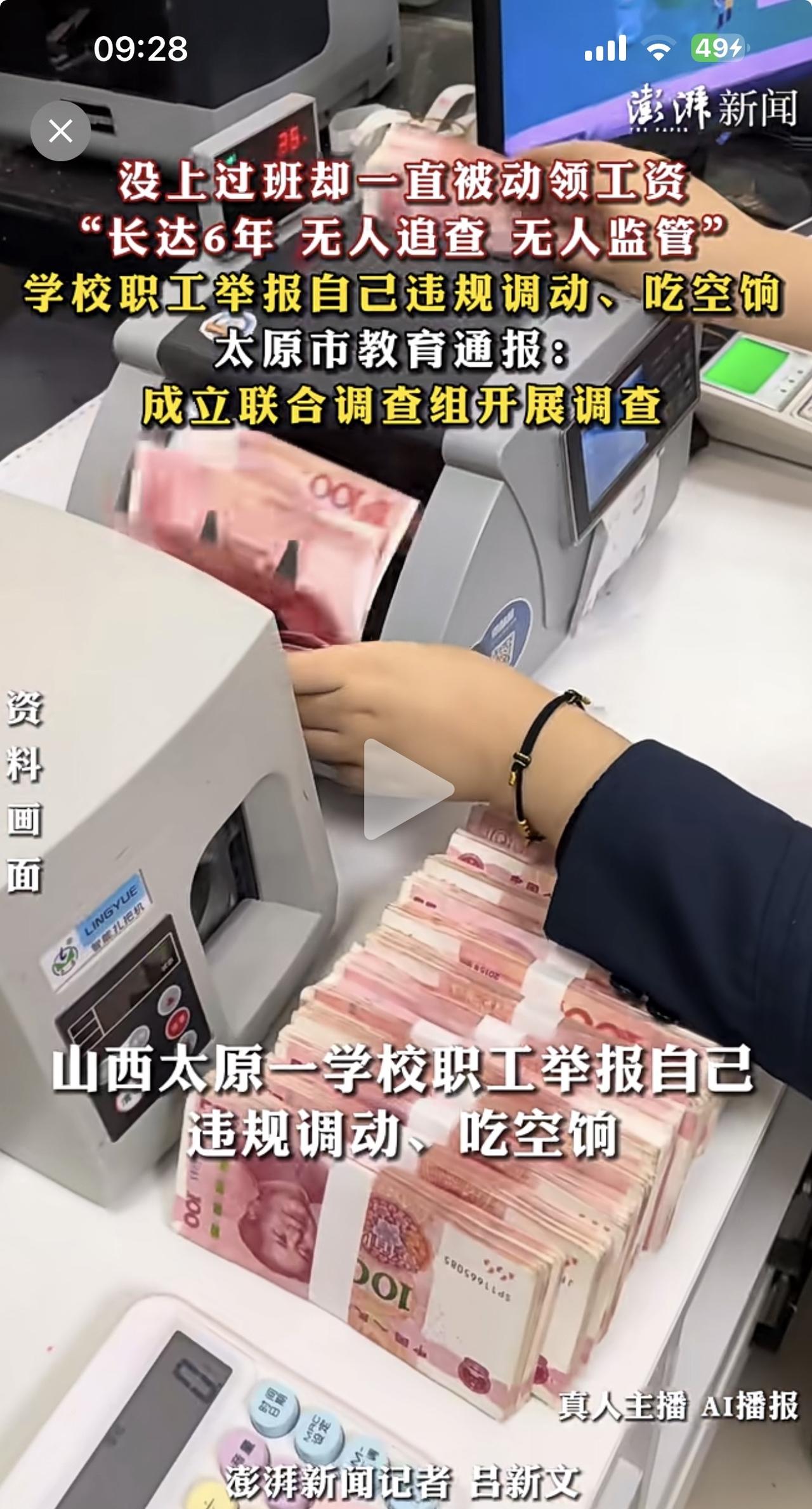 自己举报自己没有上过一天班,违规调动,违规领工资,吃空饷长达6年,神奇了! 听说过大义灭亲的,但是没有见过自杀式举报自己,大义灭自己的!这是怎么回事呢? 原来柳先生2019年从山西省经贸学校调动到太原市第二十九中学工作,但是这个调动纯粹就是别人操弄的被调动,只是利用了他的身份信息,跟他一毛钱关系没有!他也没去该中学上过一天班。 当地的财政部门居然一直为这个从未到岗的“数字人”发工资,时间长达6年!按照每年10万收入,至少就是60万元了,事实上作为一个省级城市的学校教师,肯定不止这个数。 这么多年,人事部门,教育部门,学校领导,财务人员他们居然配合得如此密切,密不透风,他们在为谁保密?谁在领取这个工资? 目前,太原市教育部门已经成立联合调查组开展调查,我相信这背后的腐败分子现在已经惶惶不可终日,将很快浮出水面!