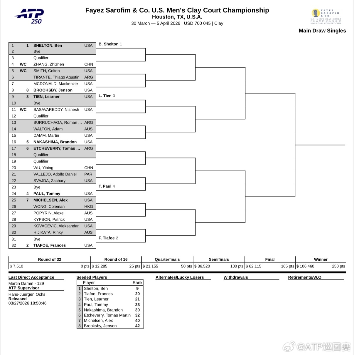 ⭕️ATP250法耶兹-沙罗菲美国男子红土网球锦标赛🔥📍美国·休斯顿📅3月30日-4月5日🎾布鲁克斯比以卫冕冠军身份出战,谢尔顿、蒂亚福领衔,吴易昺、张之臻首轮均对阵资格赛选手,黄泽林则面对7号种子米克尔森。