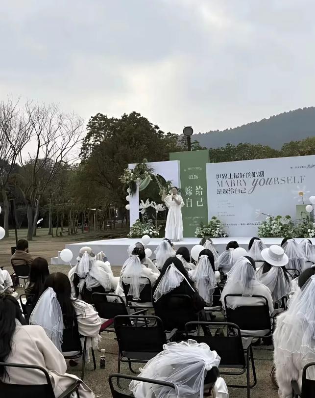 3月6日,在江苏苏州一女性俱乐部在苏州白马涧龙池景区举办了一场名为“嫁给自己”的女性主题活动,网友:仔细看看照片里的各位,深感相由心生是多么的准确。 3月6号那天一个女性俱乐部在苏州白马涧龙池景区搞了场主题活动,名字起得挺有意思,叫“嫁给自己”。 这年头姑娘们喊着要独立、要自爱的不少,可真弄个仪式,正儿八经地跟自己“结婚”的,倒也稀罕。 消息传开那会儿,不少人还觉得挺前卫,想着这大概又是哪拨时髦女性的先锋实验。 可网友那张嘴啊,向来是不饶人的,等现场的照片传出来,关注的焦点全跑了偏,照片里头的女士们,按说都是来“娶自己”的主角,本该是春风满面、喜气洋洋的,可围观的人却从她们的脸上,咂摸出了别的味道。 说“相由心生”的那位,算是把话说得文雅了,潜台词无非是觉得这些人的面相,看起来不是那么好惹,言语间甚至带上了几分调侃和揣测,好像她们之所以要“嫁给自己”,都是因为身上那股子拒人千里的劲儿。 这事儿要是搁在以前,大概就是一场猎奇的围观,大伙儿看看热闹,议论几句长相,过两天也就忘了。 但这次不一样,因为照片里捕捉到的那些神态,跟很多人心里头“爱自己”该有的松弛模样,确实对不上号。 那种拧巴的严肃劲儿,让原本该是轻松浪漫的“自嫁”,看起来倒像是某种带着怨气的宣言。 其实认真想想,这事儿的荒诞感打哪儿来的?不是“嫁给自己”这个念头不对,而是当一群人把一件私密且需要内心真正平和的事,办成了一场统一着装、统一表情的集体仪式时,就难免让人觉得刻意了。 真正的爱自己,大概不是非得在景区里办场活动告诉全世界,而是哪怕一个人待着,也能把自己哄开心了,脸上带着那种不设防的笑。 当然揪着几张照片去评判一群人,也未必公平,谁还没个被拍丑了的时候呢? 只是这件事给大伙提了个醒,当我们在谈论“爱自己”的时候,到底在爱什么?是爱那个在人群里看起来独立、强悍的影子,还是爱那个会疲惫、会脆弱、也会因为一朵花开而真心微笑的普通人, 一场春日里的活动,最后成了大家关于“相”与“心”的谈资,倒也符合互联网的脾性。 只希望照片里的那些女士,要是真看到了那些评论,别往心里去,毕竟嫁不嫁给自己,日子都是自己过,心里头要是真舒坦了,那面相迟早也会跟着柔和起来的。
