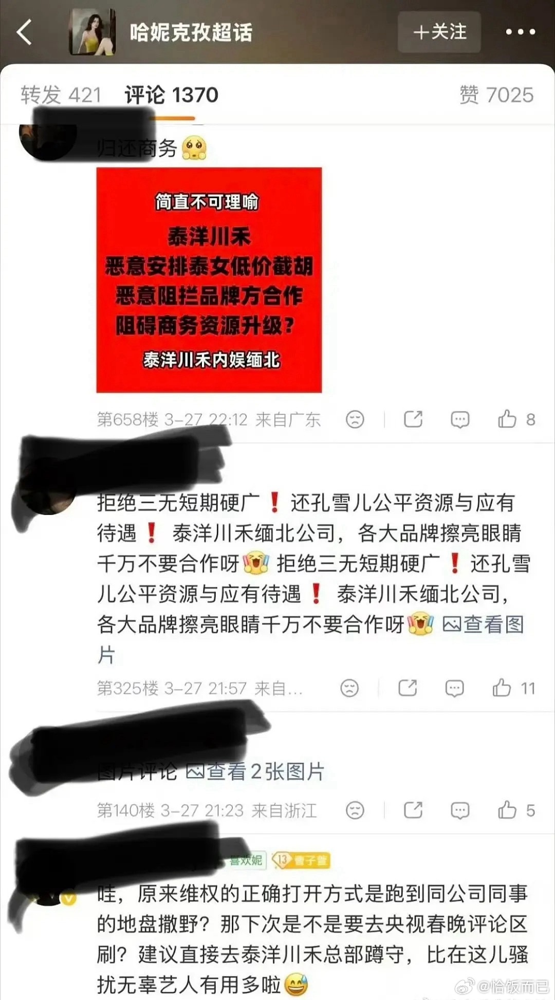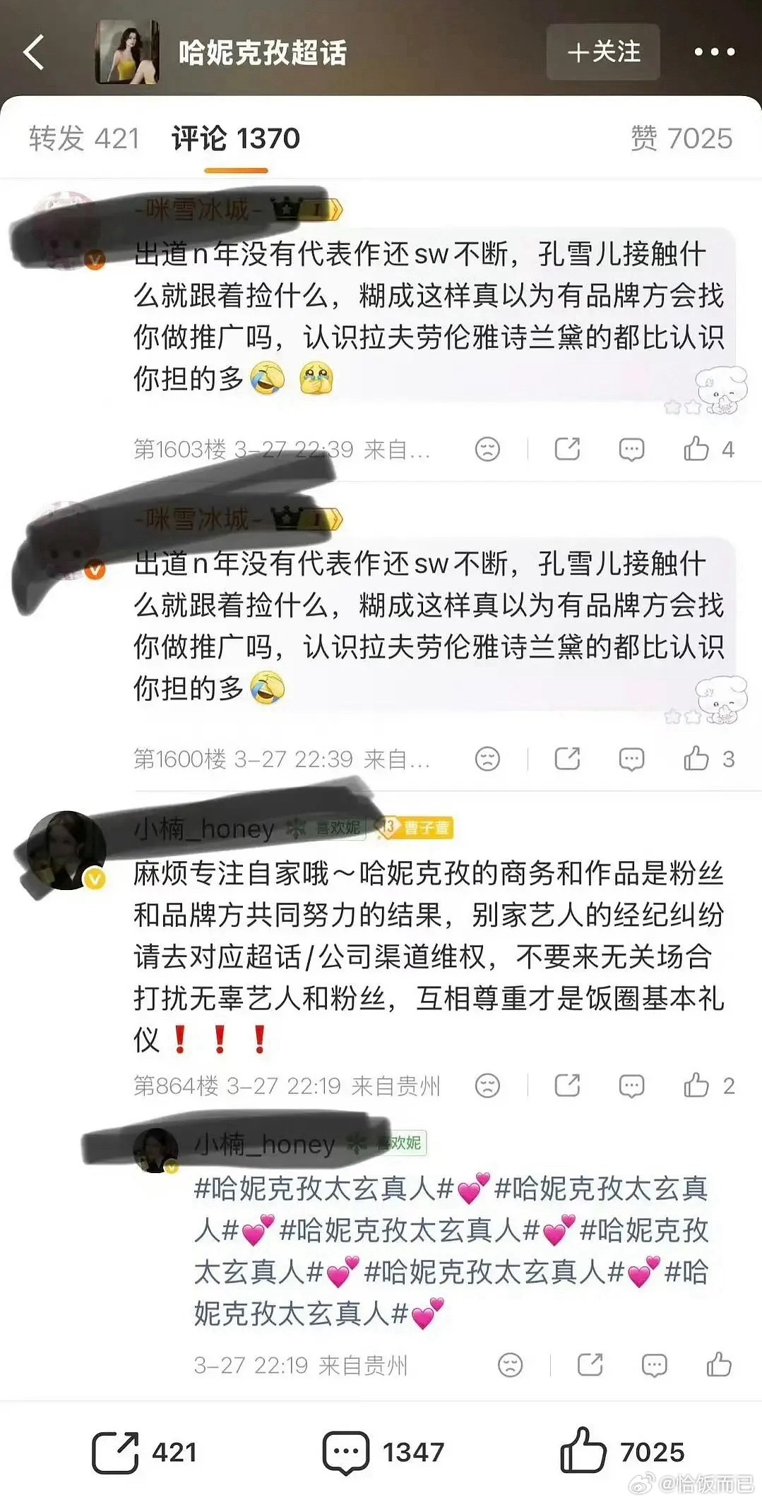 有点离谱,孔雪儿刚有效播剧,粉丝就把哈妮克孜的商务博给冲了,刚有点好感又被粉丝浇灭了
