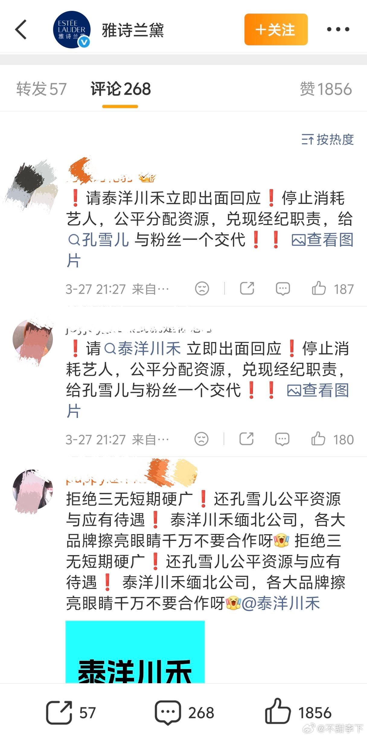 看了一下,因为跟孔雪儿一个公司的艺人哈妮克孜和她商务重合了(我看有人说雅诗兰黛孔雪儿是六年前推广的,现在拿出来说),然后粉丝就去冲哈妮和品牌,工作室就出来劝粉丝。