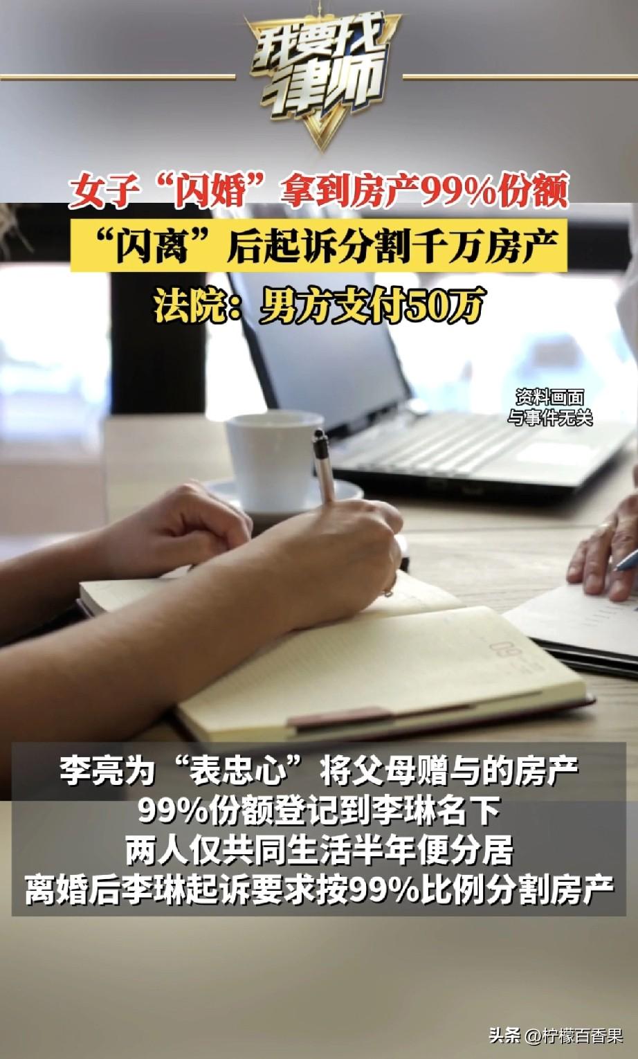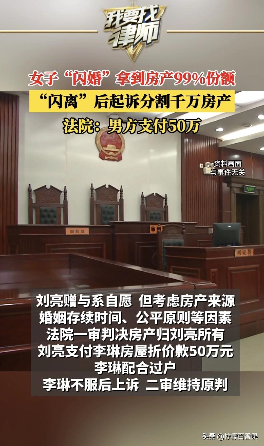 闪婚拿99%房产,闪离要分千万!法院:只给50万! 上海这起“闪婚闪离分房产”的案子,看完真的让人火大又解气! 36岁离异带娃的李琳,跟23岁的刘亮谈了10个月恋爱就闪婚。为了给孩子迁户口上学,她哄着刘亮把他父母拆迁得来的千万房产,硬生生把99%的份额都过户到了自己名下。 结果呢?婚姻撑了3年多,俩人真正在一起过日子才半年,李琳就三次起诉离婚,张口就要按99%的比例分走近千万房款,算盘珠子都快崩我脸上了! 谁知道法院根本不吃这一套: 房子是男方父母的拆迁房,李琳半毛钱没出,半分力没出; 俩人闪婚闪离,没孩子没长期共同生活,凭啥靠一张房产证就想坐享其成? 最后直接判:房子归刘亮,只给李琳50万补偿,二审还维持原判! 说真的,这判决太解气了!这才是法律该有的样子: 以前总有人说“房产证写谁名字就是谁的”,但这次法院直接戳破了这种投机的幻想: 婚姻从来不是算计财产的工具,产权登记也不是薅羊毛的护身符。 你没真心付出过,没跟人一起扛过事、熬过苦,光靠小聪明钻法律空子,最后只会搬起石头砸自己的脚。 也想给所有年轻人提个醒: 别为了户口、房子就随便闪婚,更别把伴侣的信任当筹码。 真正的日子,从来不是靠一纸房产份额绑出来的,是两个人真心实意凑在一起过出来的。 靠算计得来的利益,终究守不住,也换不来踏实的幸福。 你觉得这判决解气吗?评论区唠唠~