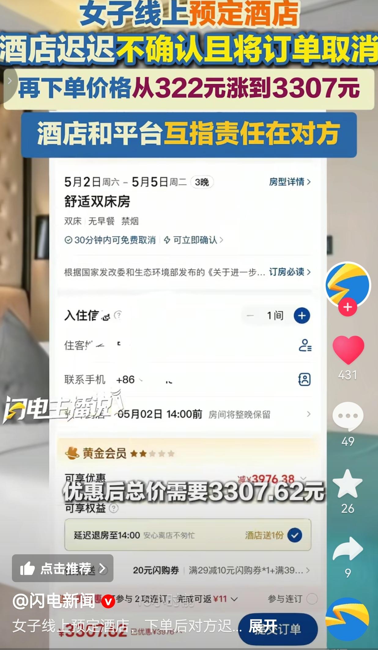 太恶心了,3月27日,云南一位小姐姐提前在第三方平台,订了抚仙湖希苑湖景酒店5月2日到5日的舒适双床房,三晚优惠后才322.41元!这价格,能住湖景房,简直是捡漏的快乐,她当时肯定美滋滋等着五一去看海。 结果呢?付完钱后,酒店就一直拖着不确认订单,页面永远显示“等待酒店确认”,连个准信都不给。 更让人生气的是,酒店根本就没对外放出这间房的库存,摆明了就是不想认这个低价单!小姐姐急了,反复催单,结果等来的不是确认通知,是酒店直接把她的订单给取消了! 更离谱的来了:她再去平台搜同一家酒店、同一房型、同一时间段,价格直接从322元飙到3307元!整整翻了10倍还多! 酒店和平台还开始踢皮球,把责任甩得干干净净: 酒店说:“是平台上错了价格,我们之前没调整好价格,现在已经改好了,让她自己取消订单。” 平台却直接打脸:“酒店定什么价、放什么房间,全是酒店后台自己管,我们平台根本没法操作,这锅我们不背!” 合着人家姑娘付了钱、等了两天,最后就落得个“被单方面毁约+坐地起价”的下场? 连当地市监局都介入了,平台还说会派人调查核实,可这调查要等到什么时候?小姐姐的五一假期可等不起啊!她已经保留好订单、付款记录、聊天截图,向市监局和平台投诉到底!换谁谁不气炸? 想想都憋屈!提前俩月订房,不就是图个便宜、图个踏实?结果钱付了,房没了,还被人当冤大头宰!五一本来是开开心心去度假,现在倒好,要临时找房,还得花10倍的钱,这不是欺负人吗? 网友看到后评论说:“这哪是上错价?这是看五一要到了,想把低价单全清了好卖高价!吃相太难看了!” 也有的网友说: “我也遇到过!订好的民宿被取消,再看就涨了三倍,平台和酒店一起装死,真的无助!” 还有的网友说: “322变3307?抢钱都没这么快!这就是赤裸裸的违约,必须赔到它心疼!” 也有的网友说:“合着消费者就是软柿子?付了钱不算数,想涨就涨想取消就取消?还有没有王法了!” 我真的越写越火大!这哪里是“价格标错”?这就是酒店玩的“低价引流、毁约涨价”的套路! 先把价格标得低低的,吸引你下单付款,等你付了钱、行程定死了,再找个借口把订单取消,然后把价格翻10倍挂上去——吃准了你五一没房住,只能乖乖当冤大头! 消费者的信任就这么不值钱?付了钱的订单说不算就不算?平台的保障就是个摆设?酒店的诚信就是用来收割韭菜的? 我们不怕出门花钱,怕的是花了钱还被人当傻子耍!怕的是明明占理,却被商家和平台互相推诿,叫天天不应叫地地不灵!怕的是这种坐地起价的歪风没人管,以后谁都敢随便取消订单、随便涨价! 这已经不是一桩小事了,这是在践踏消费者的基本权益,是在破坏整个旅游市场的规矩!如果这种行为都能被纵容,那以后谁还敢提前规划旅行?谁还敢相信线上预订? 订单可以取消,良心不能丢;价格可以涨,底线不能破! 信息来源:闪电新闻