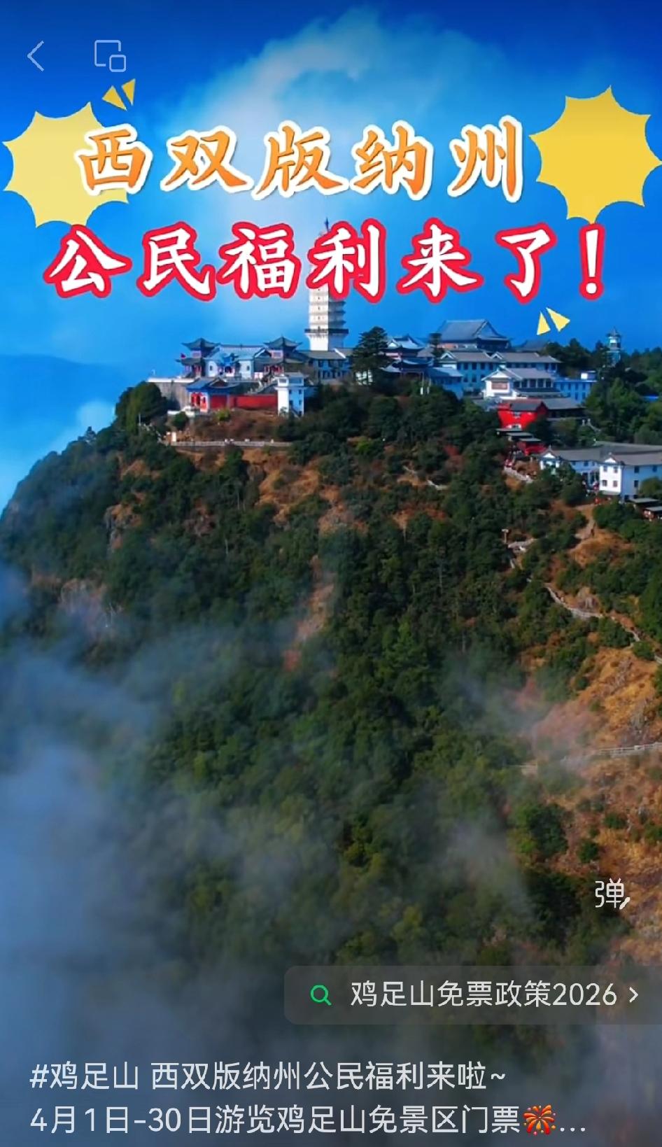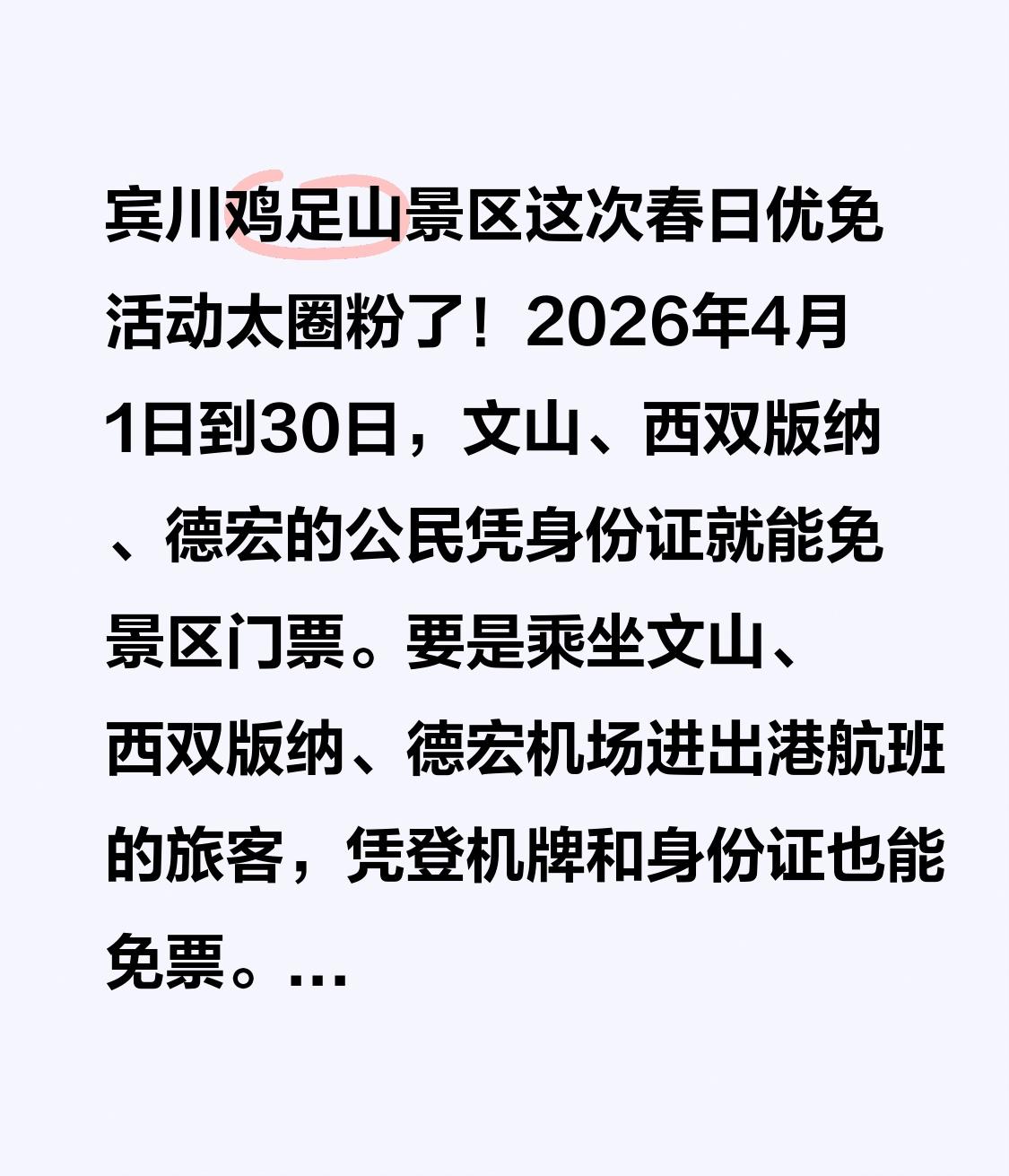 宾川鸡足山景区这次春日优免活动太圈粉了![烟花][烟花][烟花][福][福][福] 2026年4月1日到30日,文山、西双版纳、德宏的公民凭身份证就能免景区门票。要是乘坐文山、西双版纳、德宏机场进出港航班的旅客,凭登机牌和身份证也能免票。 这优惠力度,赶上泼水节的热闹劲儿,绝对让人心动。想象一下,在泼水节尽情狂欢后,去鸡足山看云海翻涌、听松涛阵阵,感受山间禅音,治愈身心。 这么棒的活动,必须去打卡! 大理宾川鸡足山 免门票 泼水节 文山 德宏 西双版纳