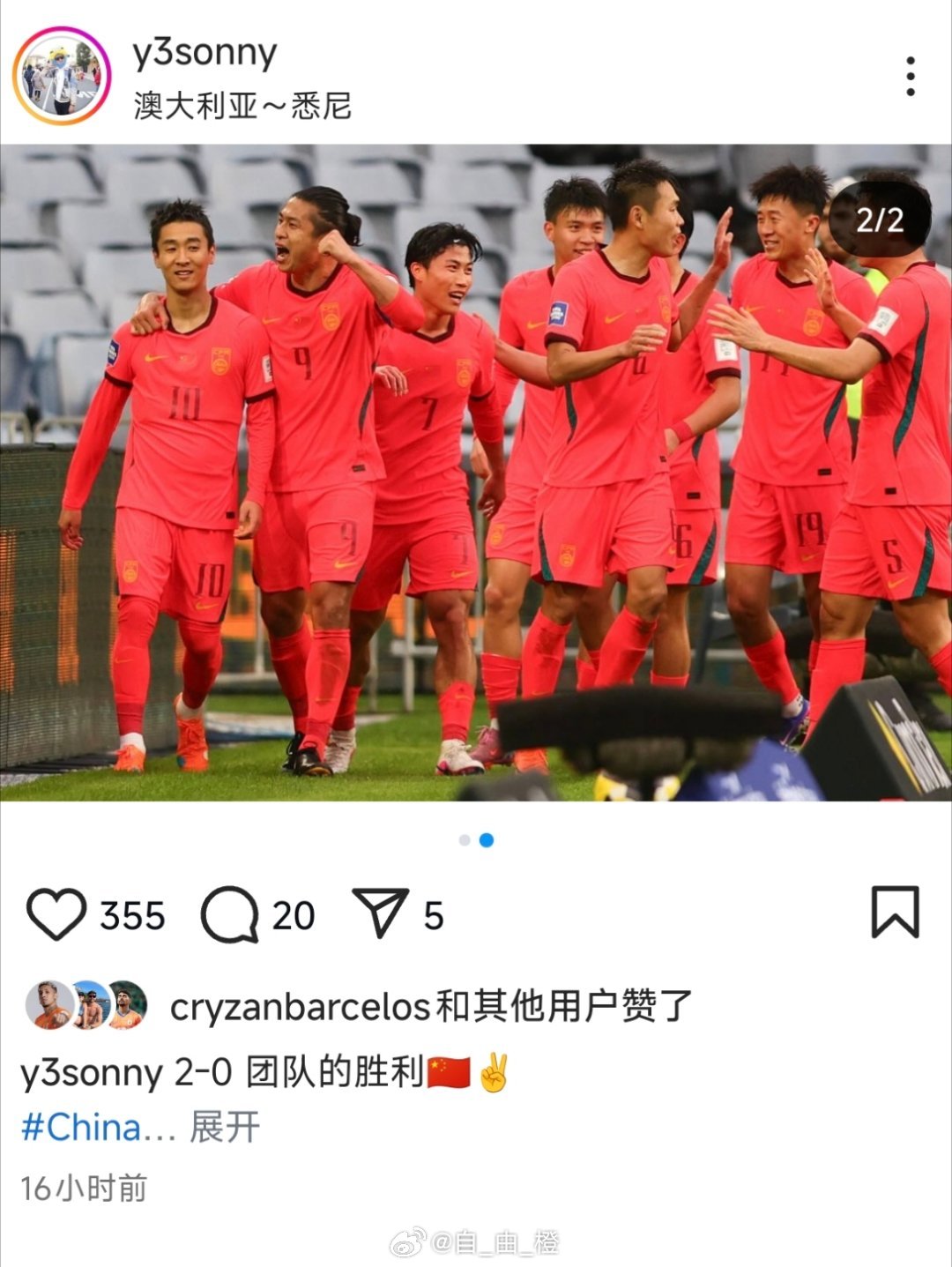 刘洋更新社媒并配文:2-0团队的胜利自由橙山东泰山