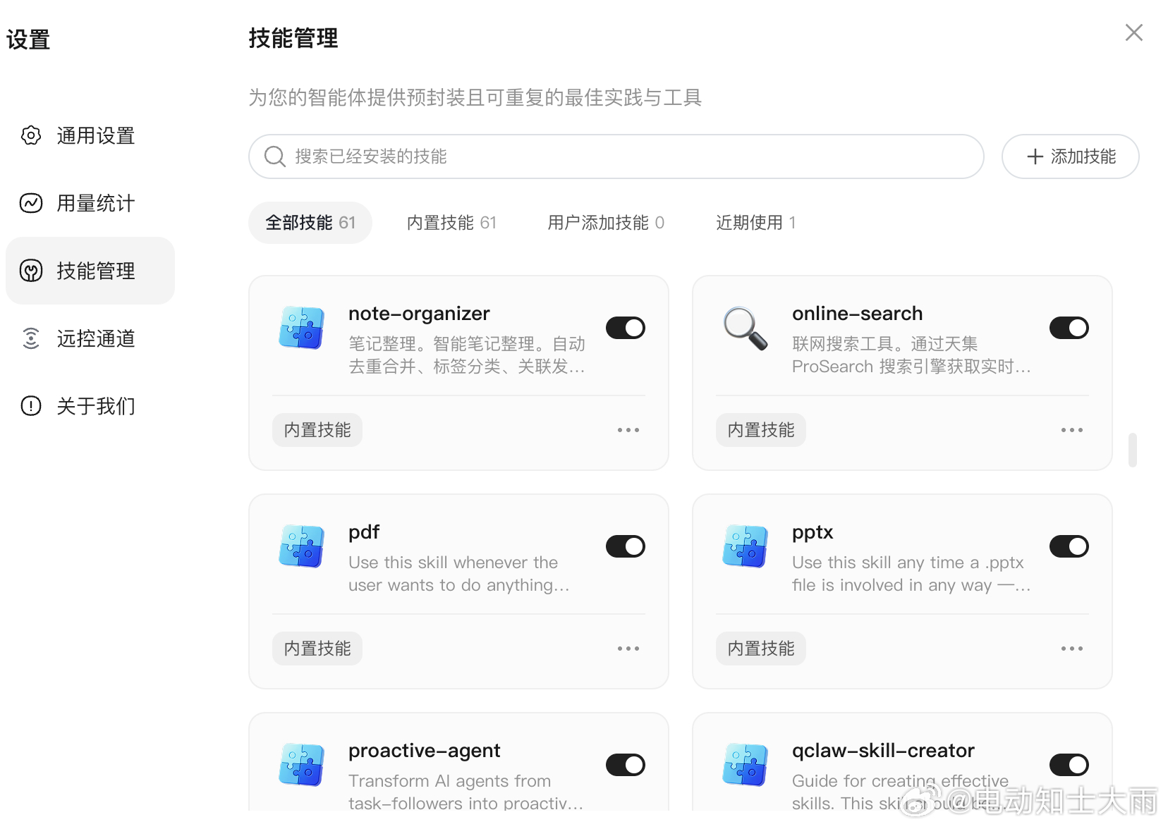 优势是IM助手可选多,配置简单,尤其是可以使用微信;配置的60个Skill也基本够用了。