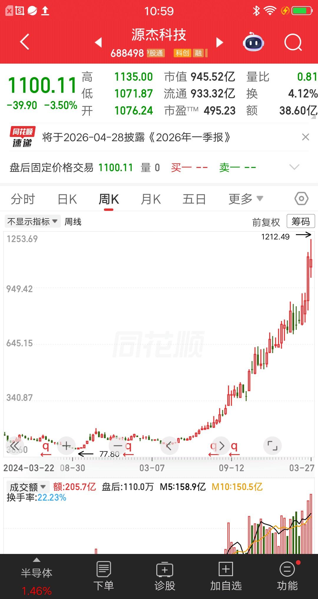 一位山东的股民全仓梭哈了源杰科技,成本1107元买了1100股,花了120多万元。这么多钱多少人一辈子都赚不到,可以买一套新房了,贫穷限制了我的想象力呀。他在自媒体平台上,分享了自己的持仓,并且说了买入逻辑。 他是在盯盘的时候,看到快讯说源杰科技市值破千亿,好奇心驱使下点进去看了看。发现股价竟然比寒武纪还高,想要买的冲动一下子起来了。 他的逻辑很简单,寒武纪够牛了吧,股价能和寒王持平,足以说明公司的实力。而且寒王最高市值超过5000亿,源杰科技才1000亿,他觉得源杰科技股价才刚起步。大A历史上,股价市值同时破千的股票寥寥无几。他越想越觉得,这公司太牛了。 有人评论说,“你去看看周线图吧,都涨了十几倍了,当心套在山顶,猴年马月才能解套”。 他的反驳也很犀利,而且直击散户要害。股价翻倍的时候,有人觉得高不敢买。股价涨三五倍的时候,更不敢买了。结果呢,涨了十几倍,这就是散户赚不到钱的根源。 每个人都有自己的看法,都要为自己的决策,承担相应的后果。真心希望这位山东股友,能赚大钱。