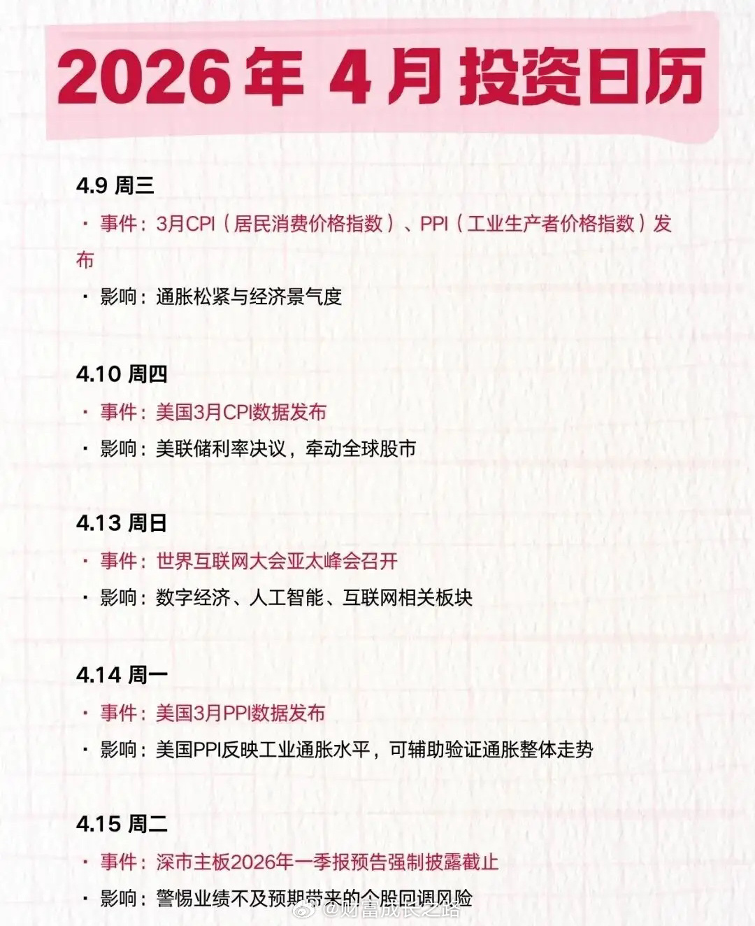 2026年4月投资日历|关键事件与机会梳理。4月是A股年报+一季报收官月,叠加宏观数据发布、美联储议息会议与产业展会密集落地,市场将围绕业绩验证、政策导向、事件催化展开博弈。值得关注的大事件有低空经济大会、全球6G大会、中国算力大会等等。- 上中旬:重点关注美国非农、CPI/PPI等通胀数据,判断美联储降息预期与全球流动性方向;低空经济、大健康、数字经济等展会将催化对应赛道情绪。