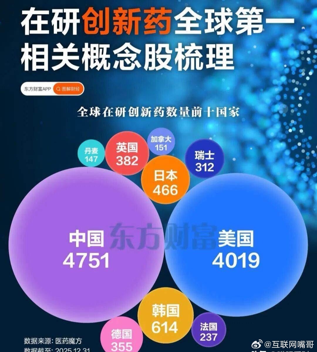 炸了!中国创新药全球第一,4751款新药硬刚美国,创新药黄金10年来了!3月27日,医药魔方最新数据显示:中国在研创新药数量已达4751个,占比全球33.7%,一举超越美国(4019个),强势登顶世界第一。中国医药产业已告别仿制时代,正式杀入全球新药创新的高地!曾几何时,我们还在为无药可用焦虑;如今,这里已成了全球新药研发的策源地。这背后,是三大底气的集中爆发:政策开绿灯,审评审批提速,优先审评再压189天,研发效率直接拉满;出海狂飙,2025年对外授权交易额破1388亿美元,恒瑞、百济等龙头赚翻全球;盈利拐点,诺诚、云顶等扭亏为盈,行业从烧钱研发迈入赚钱兑现。中国药企不再只搞“me-too”内卷,而是扎堆ADC、双抗、细胞疗法等前沿赛道,甚至敢和全球大药“头对头”硬刚。对普通人来说,以后抗癌药、罕见病药不用再等进口,国产创新药更快、更便宜、更管用。从仿制到原创,从跟跑到领跑,中国医药的黄金十年,才刚刚开始!