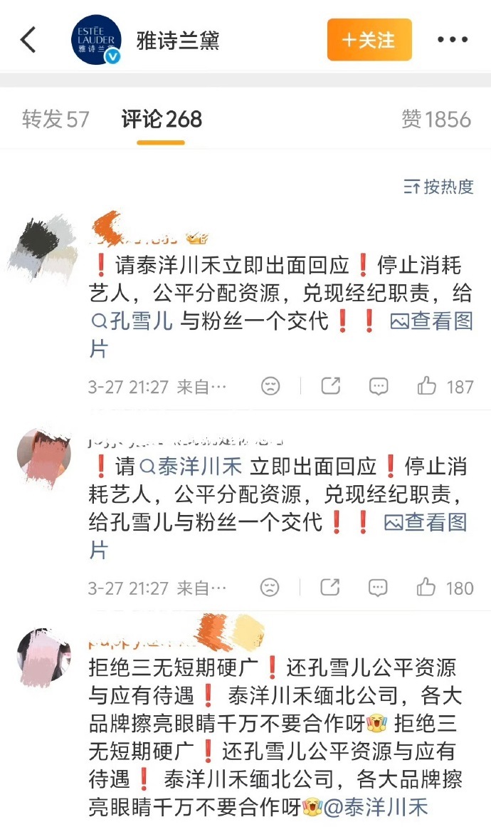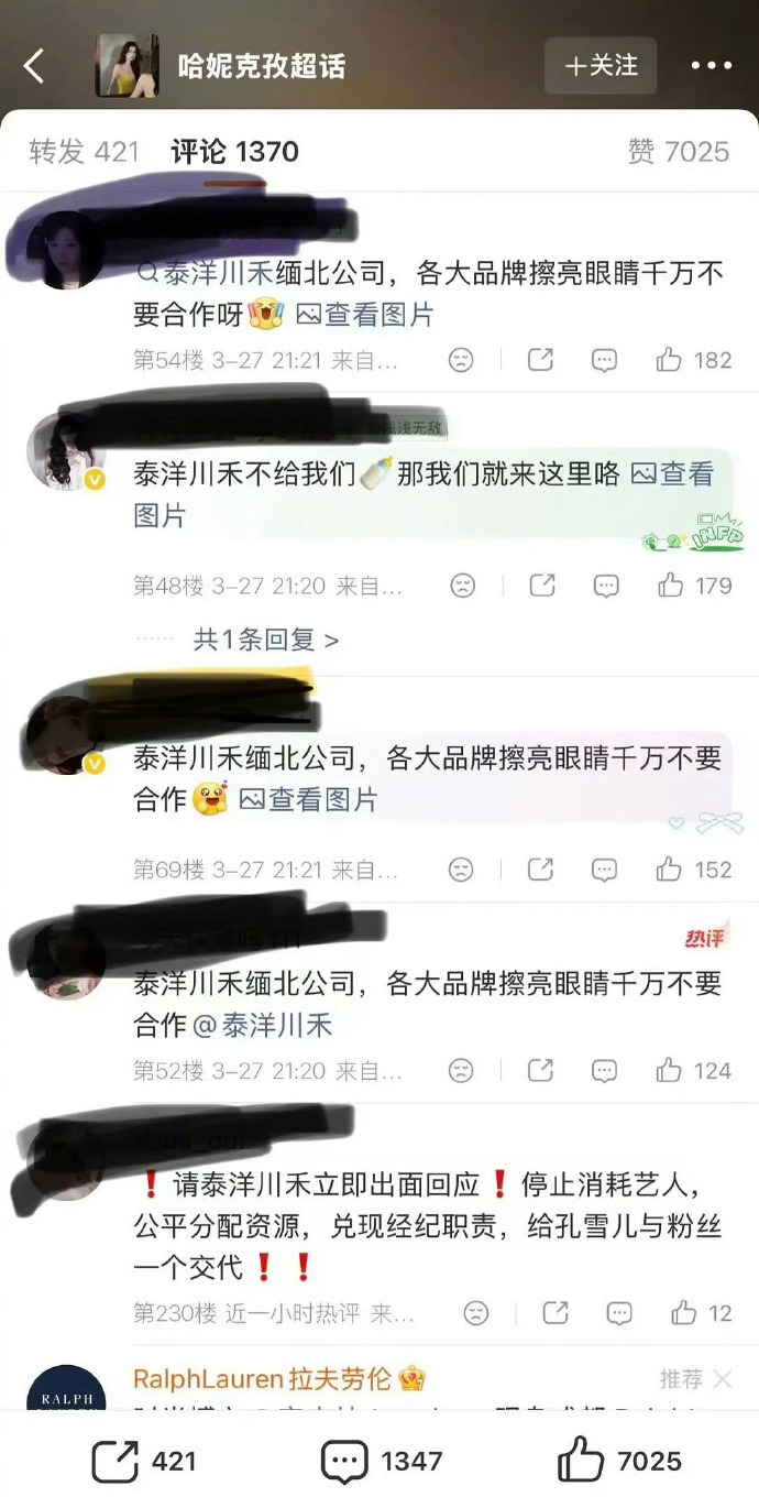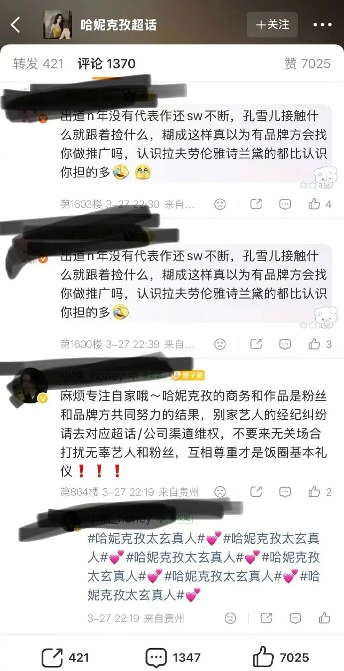 孔雪儿粉丝就因她与同公司的哈妮克孜6年前的商务重合,跑去冲了哈妮克孜和品牌方…