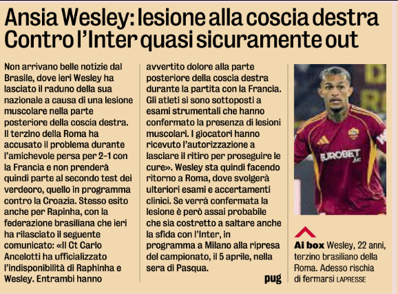 韦斯利伤势不轻,预计今天返回罗马接受进一步伤情检查。米体Pugliese表示如果伤情确认,他几乎不可能出战国米。