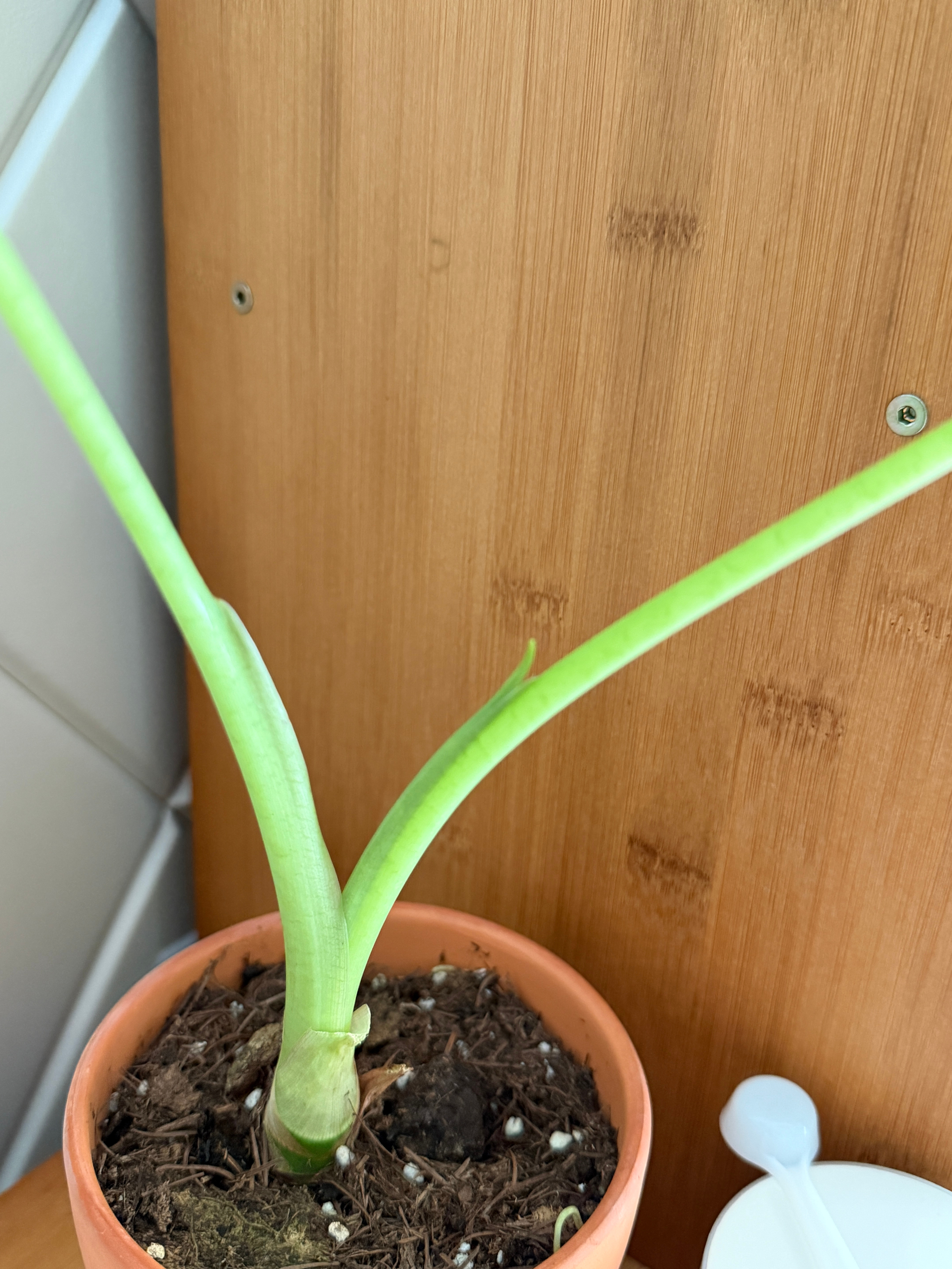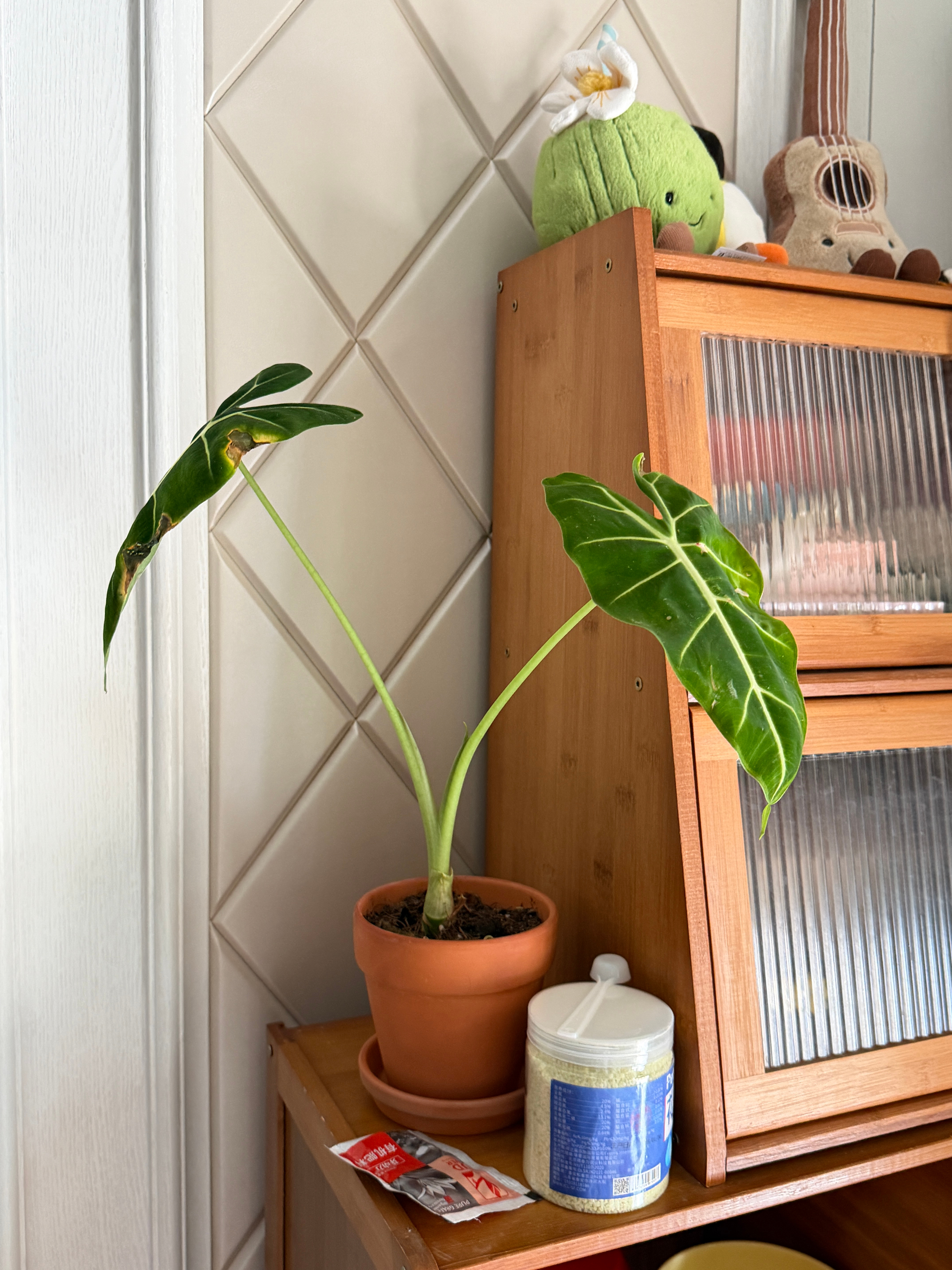 你终于要活起来了!!!刚开始买回来好多叶子摆在家里老好看了!!结果接二连三的 si 的只剩下两片...还以为就这么完了,抱着不想放弃的心理还买了肥看能不能救活,结果今天早上一起来看到新叶冒尖尖!是不是有救了我的心要化了