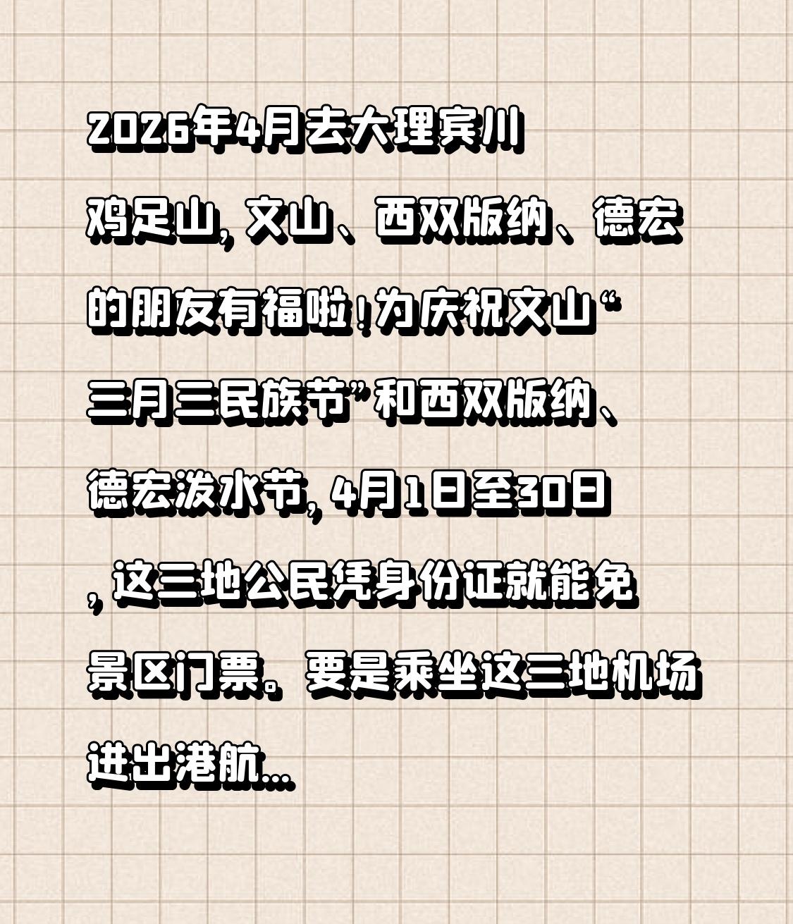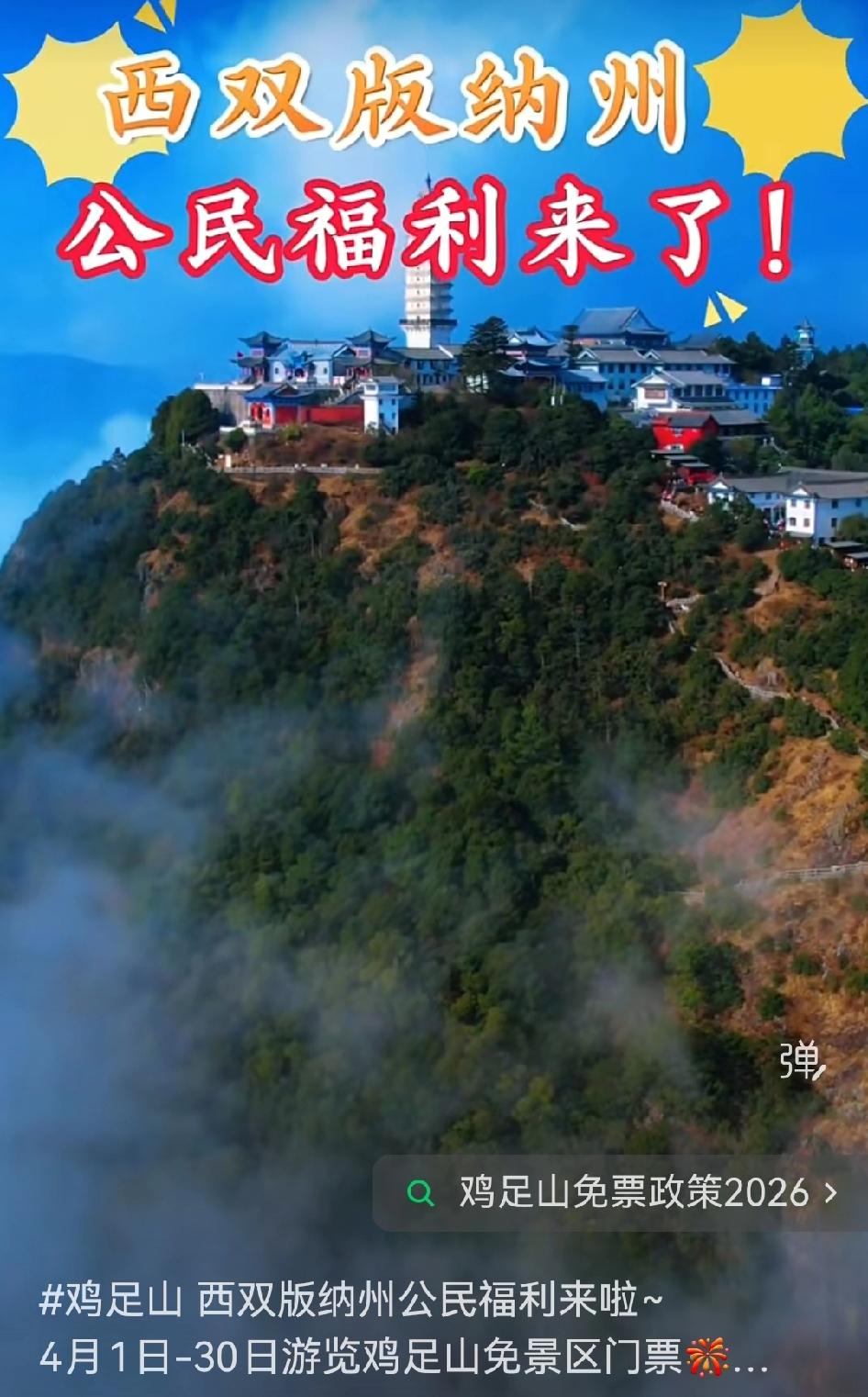 [福][福][福]2026年4月去大理宾川鸡足山,文山、西双版纳、德宏的朋友有福啦! 为庆祝文山“三月三民族节”和西双版纳、德宏泼水节,4月1日至30日,这三地公民凭身份证就能免景区门票。要是乘坐这三地机场进出港航班的旅客,凭登机牌和身份证也能免票。 鸡足山风景超绝,能看云海翻涌,听松涛阵阵,来一场治愈之旅再合适不过。自驾的话,大理出发约1.5小时,昆明出发约4小时。也能选公共交通,各地先到大理,再从大理汽车客运东站前往鸡足山。这么棒的福利,还不赶紧约上家人朋友冲!