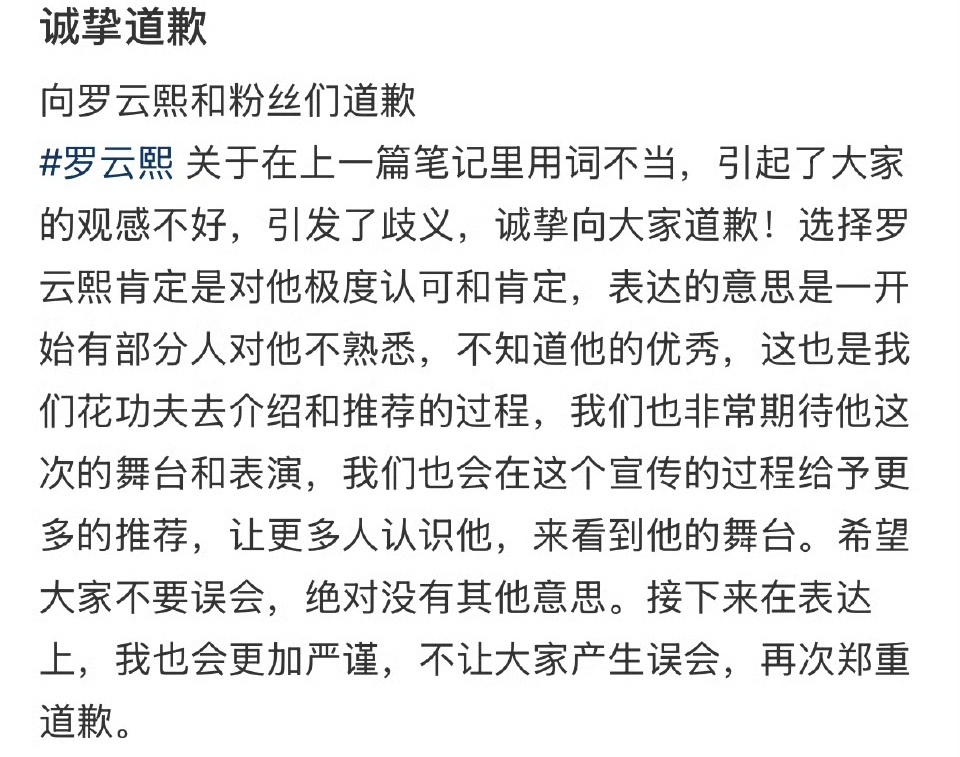 线下个人音乐会更是座无虚席、一票难求,场场创下超高热度,粉丝凝聚力、路人盘号召力有目共睹,自带顶级流量与上座保障。如今本末倒置,文案反倒说他依附音乐节、借活动东风的荒谬言论,实在让人啼笑皆非!明明是活动方看中他的实力与人气,专程邀其撑场引流、拉高格调,到头来却刻意模糊主次、颠倒因果。更令人反感的是,后续致歉依旧含糊敷衍、避重就轻。大大方方承认“我们急需罗云熙,仰仗他的实力与号召力”,当真有那么难?扭捏遮掩的态度,既辜负艺人的真诚加持,也彻底寒了粉丝的心!