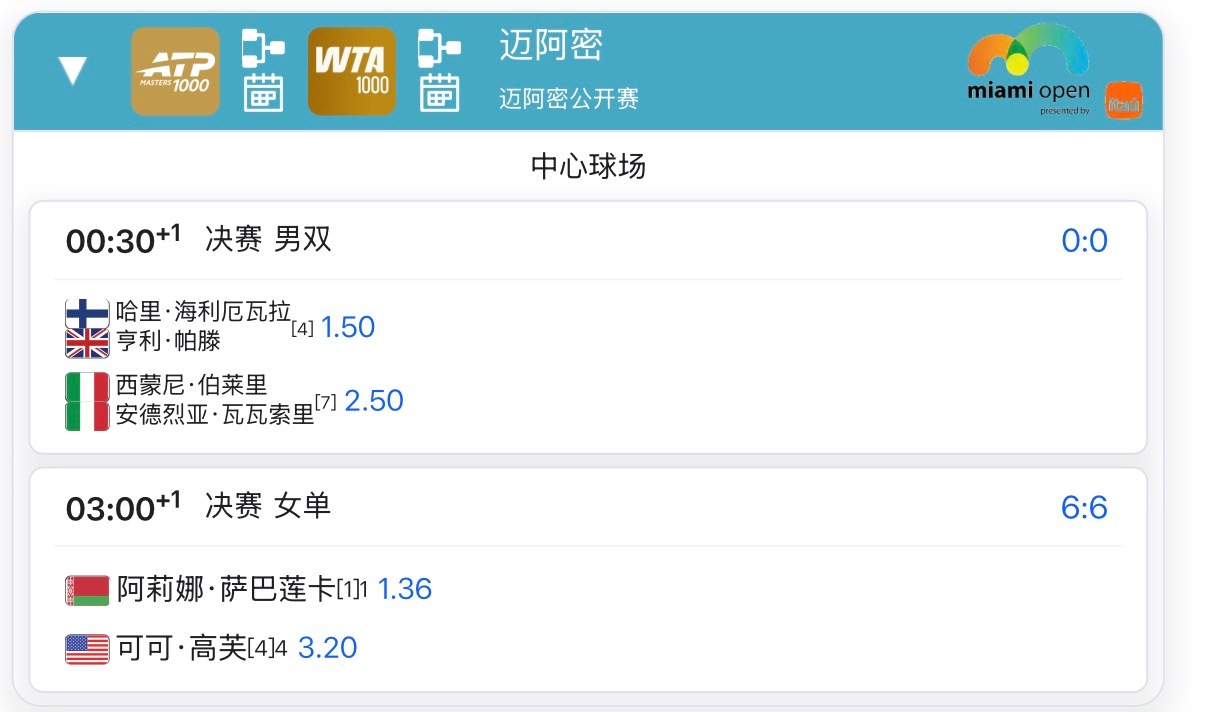迈阿密1000赛 明日赛程⏰女单决赛是凌晨3点开打,会起来看吗?萨巴伦卡vs高芙