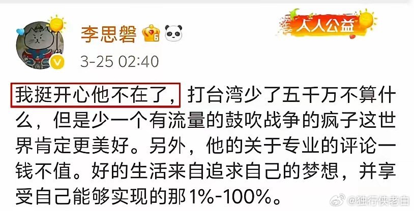说实话,我们的网络对敌对分子真的太宽容了,他们的言论自由被保护得太好了。相反,被它们贬称为“基本盘”的爱国群众,稍说错两句话动辄就被封禁。这个对张雪峰去世表示“挺开心”的李思磐,就是个润到美国的反贼。注册NGO组织,长年以女性保护为幌子打拳,挑动男女对立。这样的人,在我们网络上活得好好的,这样的事才是我们真正得反思的事。很多时候,我们该反思的没有好好反思,不该反思的瞎反思。