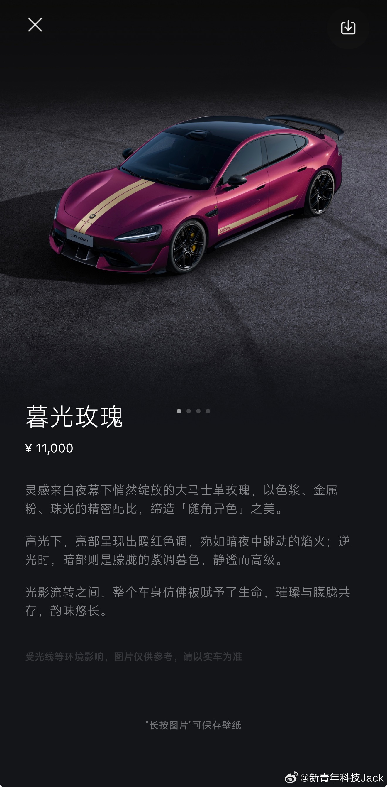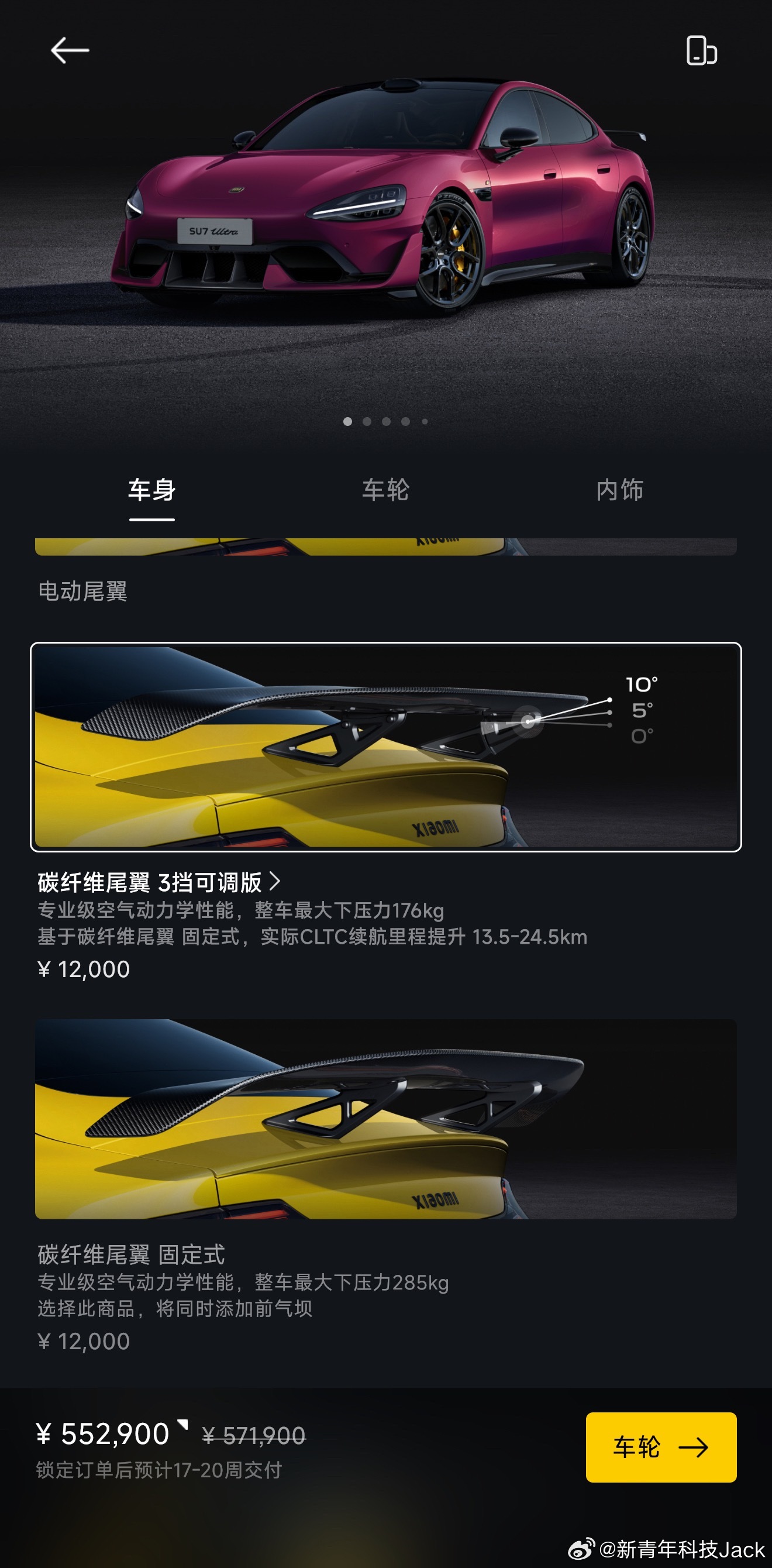 小米SU7Ultra推出了全新的暮光玫瑰色同时新增了一个3档可调的碳纤维大尾翼选配